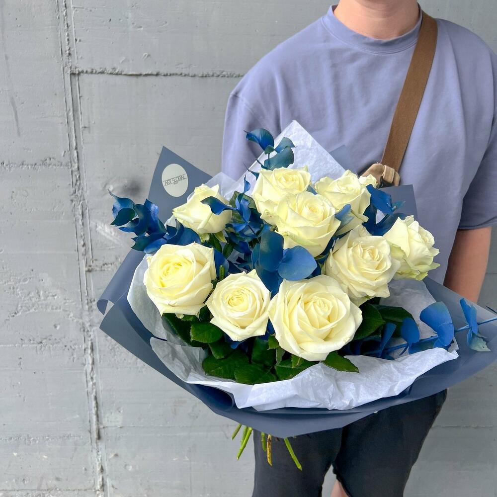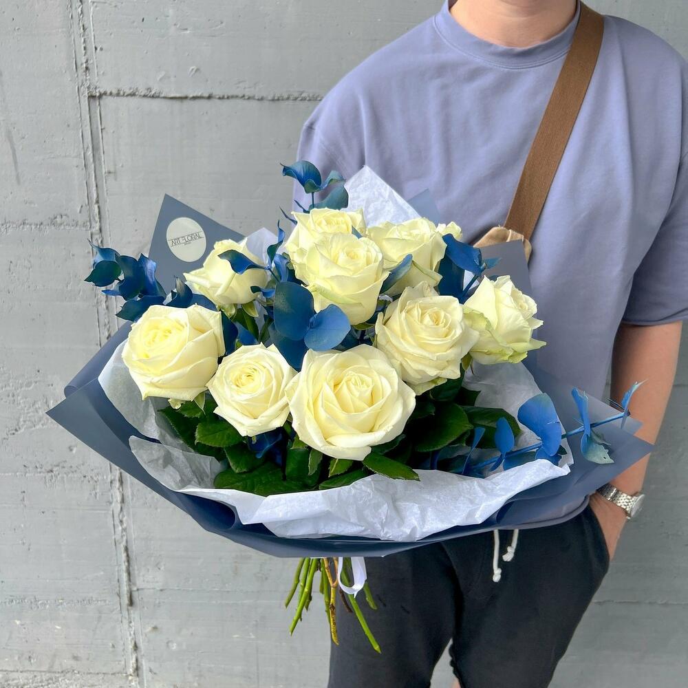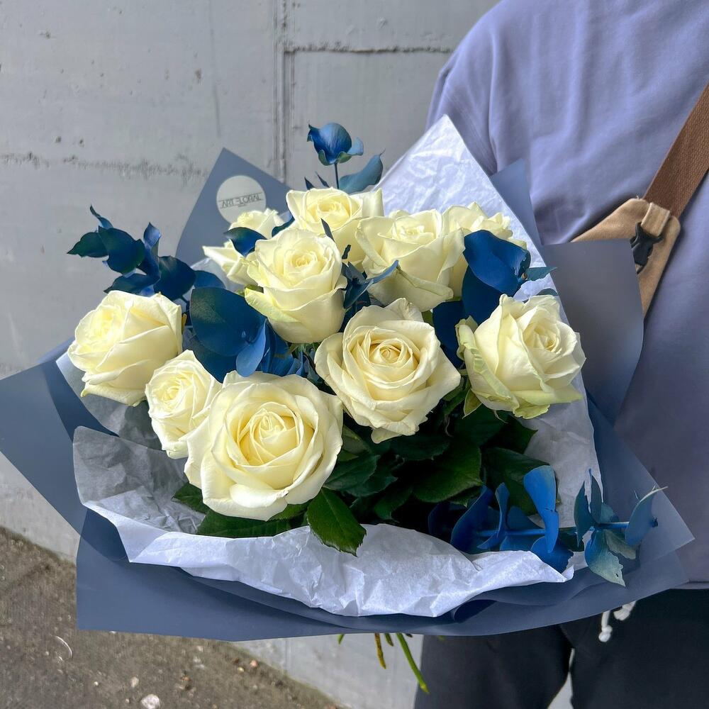 Blumenstrauß Eisblüten Erleben Sie die Harmonie von Reinheit und Frische mit unserem eleganten Strauß aus weißen Rosen und blauem Eukalyptus. Die makellosen, weißen Rosen stehen für zeitlose Eleganz und symbolisieren Liebe und Unschuld. Sie strahlen mit ihren samtigen Blütenblättern eine edle Ruhe und klassische Schönheit aus. Der blaue Eukalyptus ergänzt die Rosen perfekt, indem er eine frische, natürliche Note und sanfte Farbkontraste hinzufügt. Mit seinen kühlen blauen Tönen und der dezenten Struktur bringt er eine moderne und erdige Ausstrahlung in den Strauß. Dieser Arrangement aus weißen Rosen und blauem Eukalyptus ist eine stilvolle Komposition aus Schlichtheit und Raffinesse – ideal als Geschenk oder als charmante Dekoration für besondere Momente. Ein Bouquet, das den Raum erfrischt und Herzen berührt. Wir achten ständig auf die letzten Trends im Bereich des Floristikdesigns und unsere Bouquets sind die Reflexion davon. Bei der Zusammenstellung verwenden wir nur ganz frische Blumen und die modernsten Materialien. Unser Team steckt besondere Liebe zum Detail in jedes Arrangement, deshalb finden Sie immer einen Sticker mit unserem Logo und ein Firmen Bändchen als Qualitätssiegel an jedem Strauß. Dem Blumenstrauß legen wir eine Anleitung zur Pflege und ein Mittel zur Verlängerung der Lebensdauer der Blumen bei. Jetzt ganz bequem bestellen und Ihre Blumen an Ihre Wunschadresse liefern lassen. ширина, см: 31 высота, см: 61 длина, см: 31