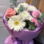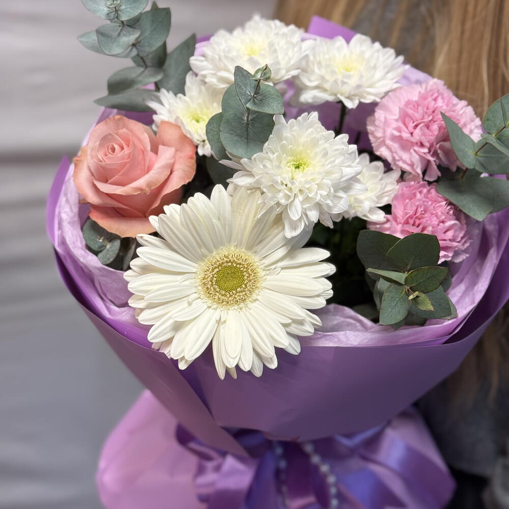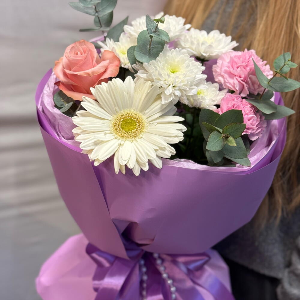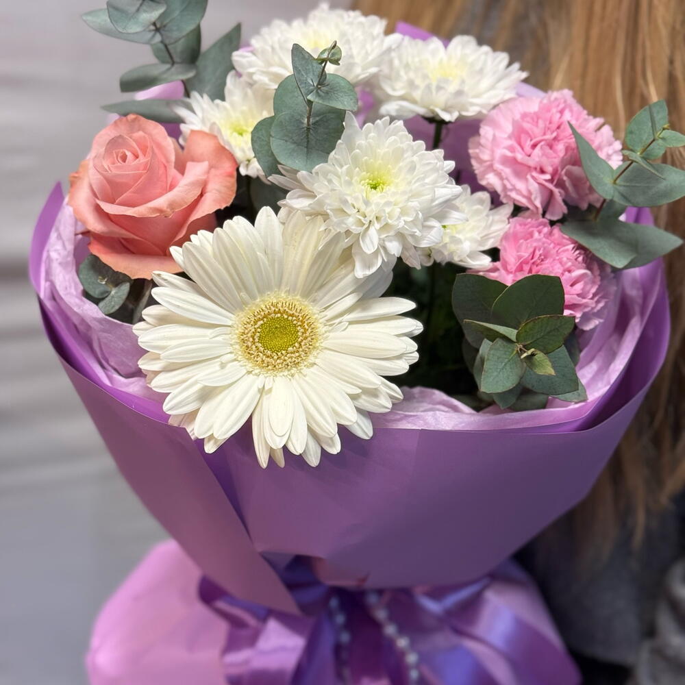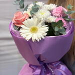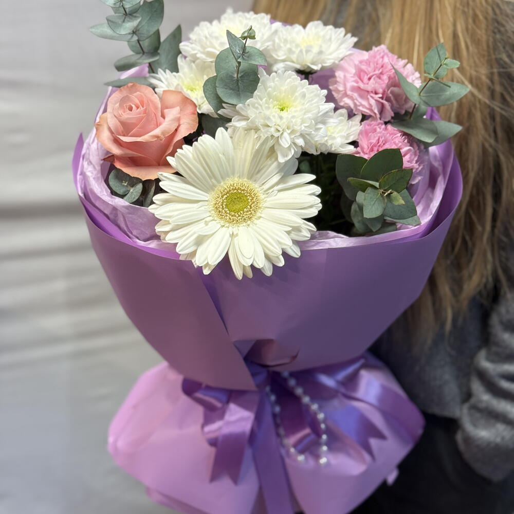 Chrysanthème - 1 pce Eucalyptus - 3 pce Gerbera - 1 pce rose d'Équateur - 1 pce disntus - 2 pce