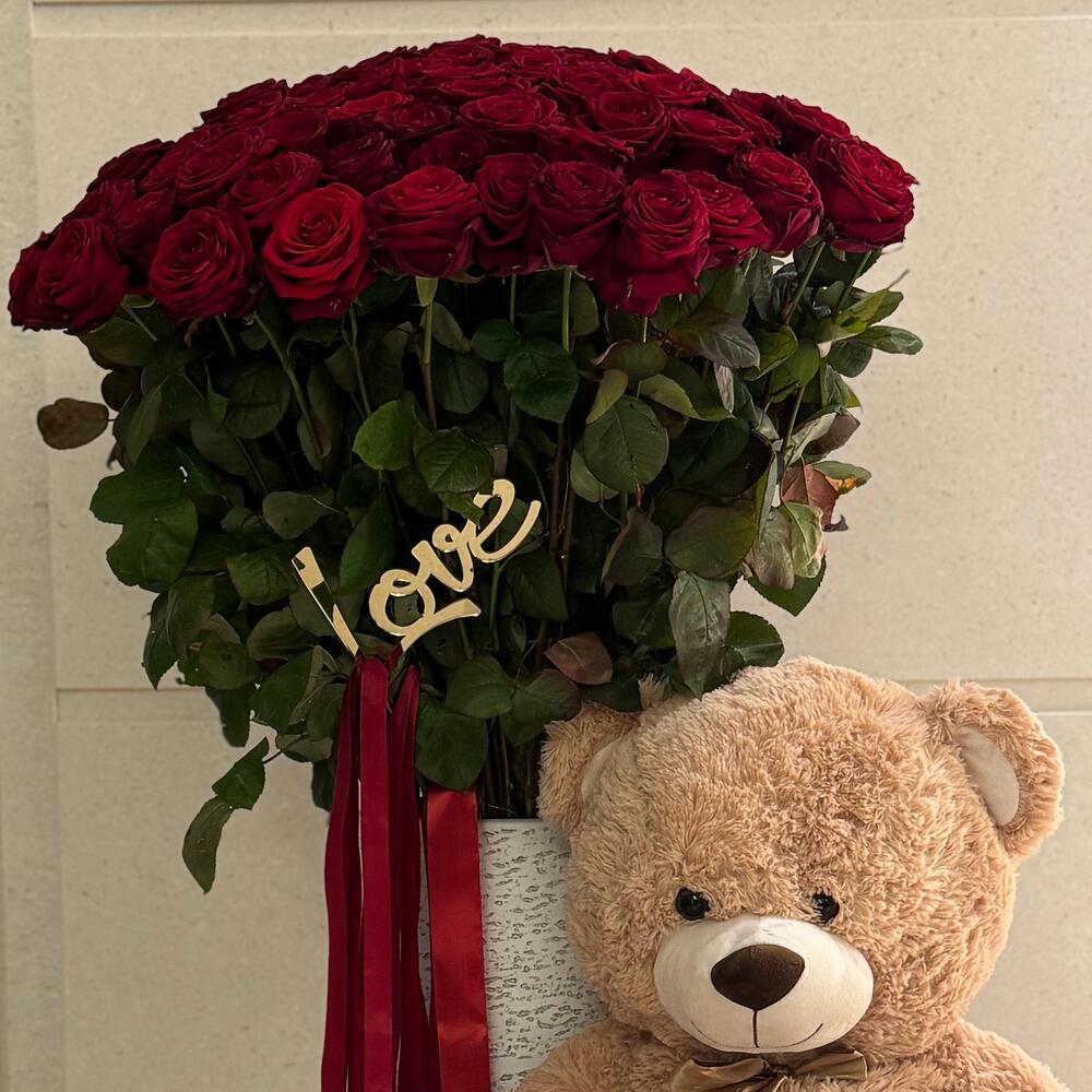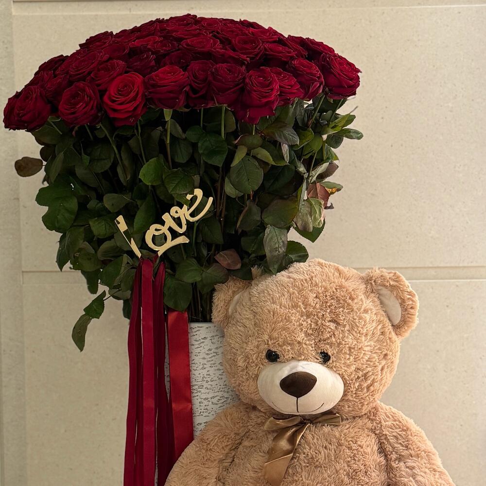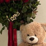 Ours en peluche - 1 pce Vase - 1 pce ribbon satin - 6 pce roses - 100 pce