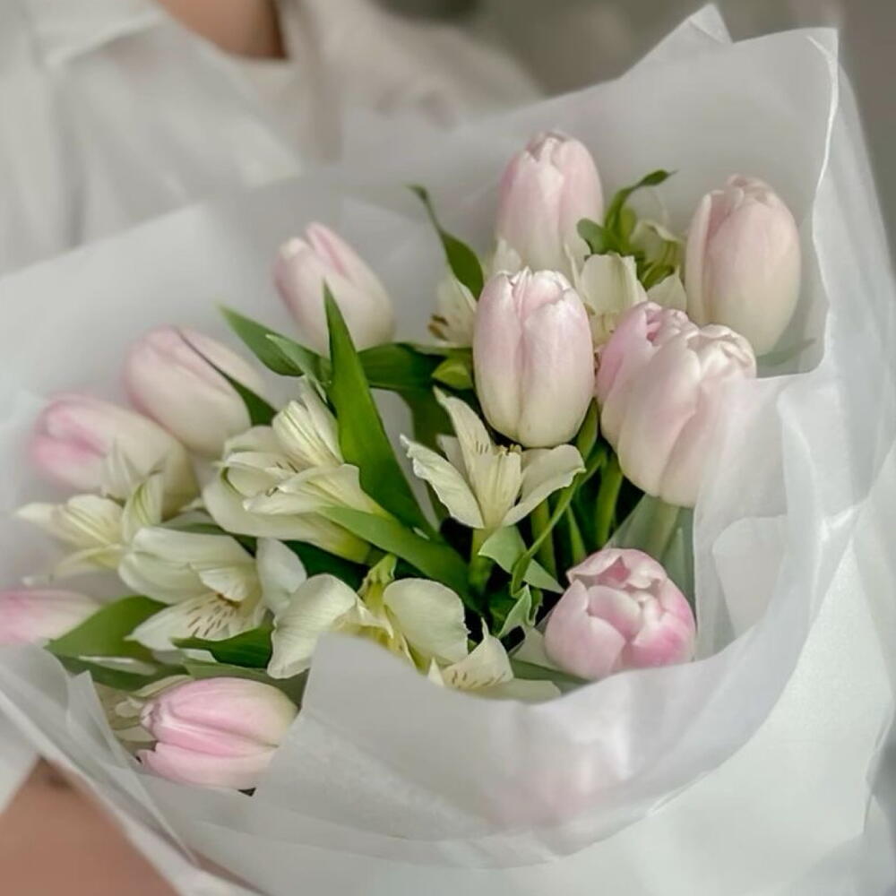 A delicate bouquet of 11 soft pink tulips complemented by 3 white alstroemerias. The light, airy palette and graceful combination of blooms create a fresh and harmonious arrangement — perfect for thoughtful gestures and special occasions. Free message card included. Kindly leave your message in the comments.