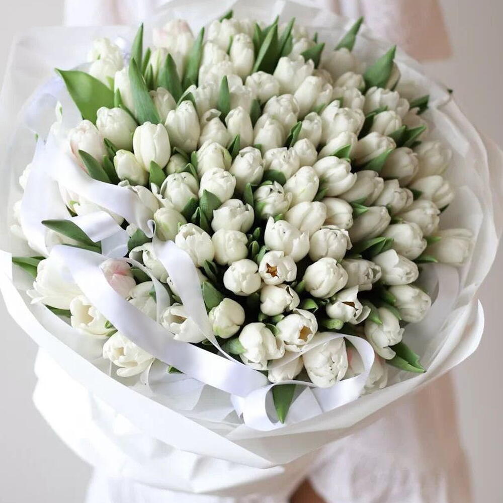 Элегантный букет из 101 белоснежного тюльпана – символ чистоты, нежности и искренних чувств. Идеально подходит для романтического признания, свадебного подарка или просто знака внимания для особенного человека.