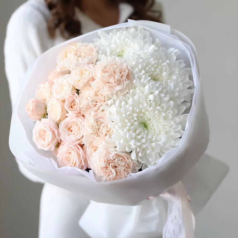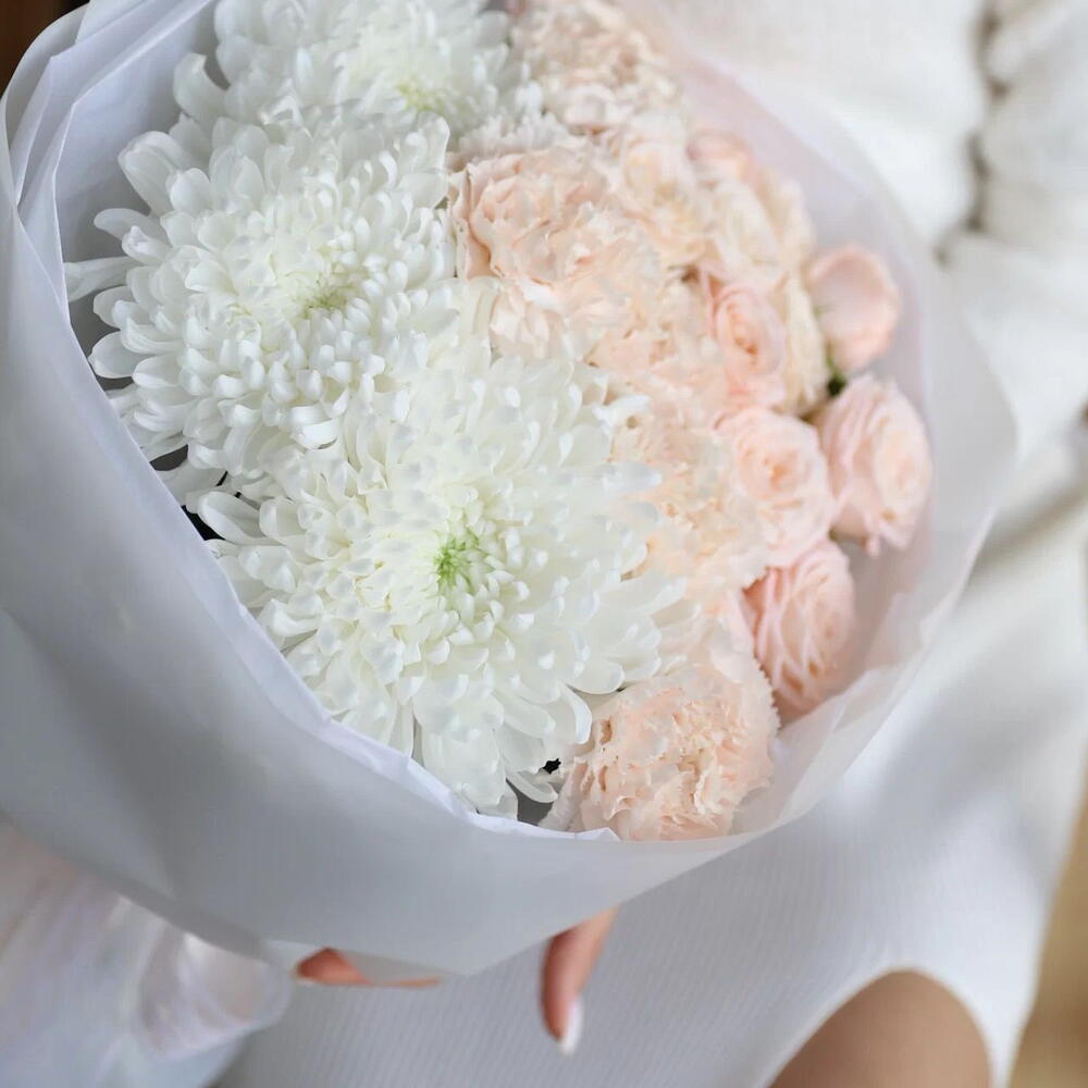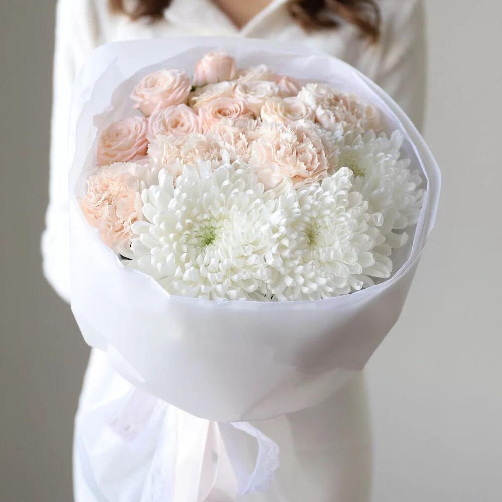 Этот изысканный монобукет станет идеальным подарком для любого повода. Он состоит из трех нежных кустовых роз, создающих великолепный центральный акцент. За их волнующей красотой располагаются три головы одноголовых хризантем, придающих букету еще большую плотность и объем. Приглушенные тона букета разбавлены пятью чарующими диантусами, которые добавляют немного яркости и контраста. Этот монобукет - символ утонченности и изящества, способен передать самые глубокие и искренние чувства.