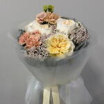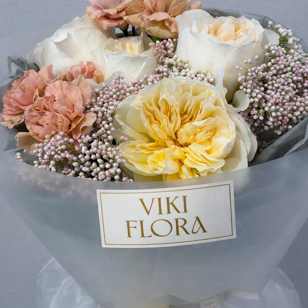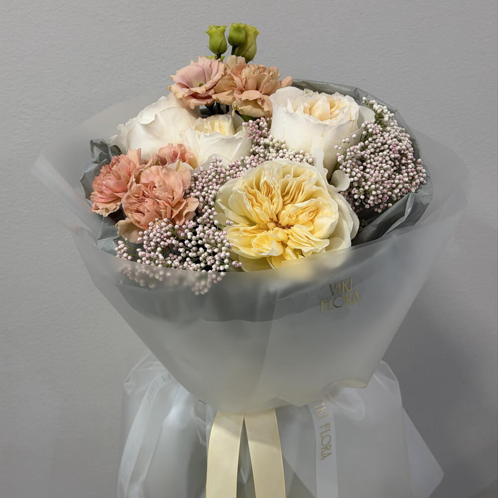 Élégant, délicat bouquet aux tons crème et pêche — une composition intemporelle qui convient à toutes les occasions. La combinaison subtile de différentes textures et nuances crée un effet harmonieux et stylé. Le bouquet a un aspect léger, moderne et très esthétique — idéal comme cadeau pour une personne chère ou comme un joli geste sans occasion. Convient pour: — anniversaire — anniversaire — remerciement — cadeau romantique Chaque bouquet est réalisé à la main, avec soin, en préservant le caractère de la composition.