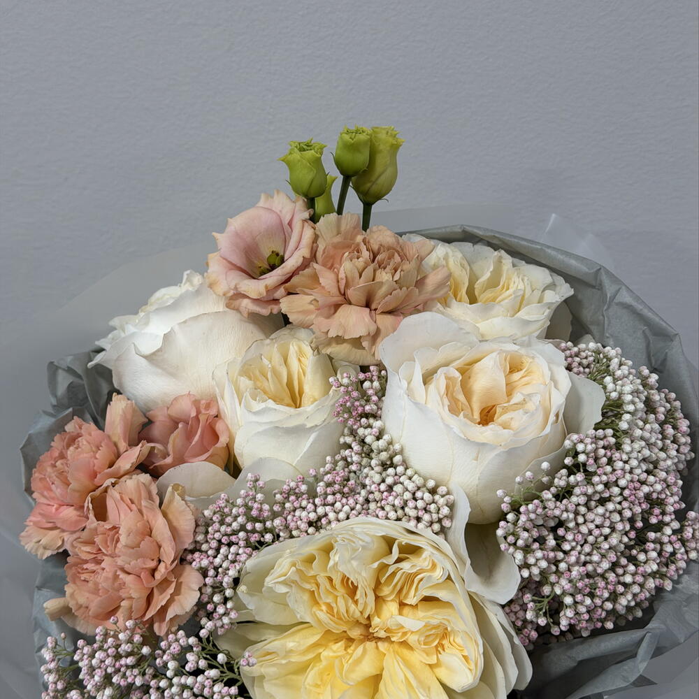 Eustoma - 1 pce dianthus - 3 pce ozothamnus - 2 pce rose pivoine - 5 pce emballage cadeau élégant + ruban en satin - 1 pce