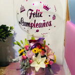 rosas - 12 pce globo burbuja feliz cumpleaños - 1 pce lilis - 4 pce roxana - 6 pce follajes finos de temporada - 6 pce vikingo - 6 pce