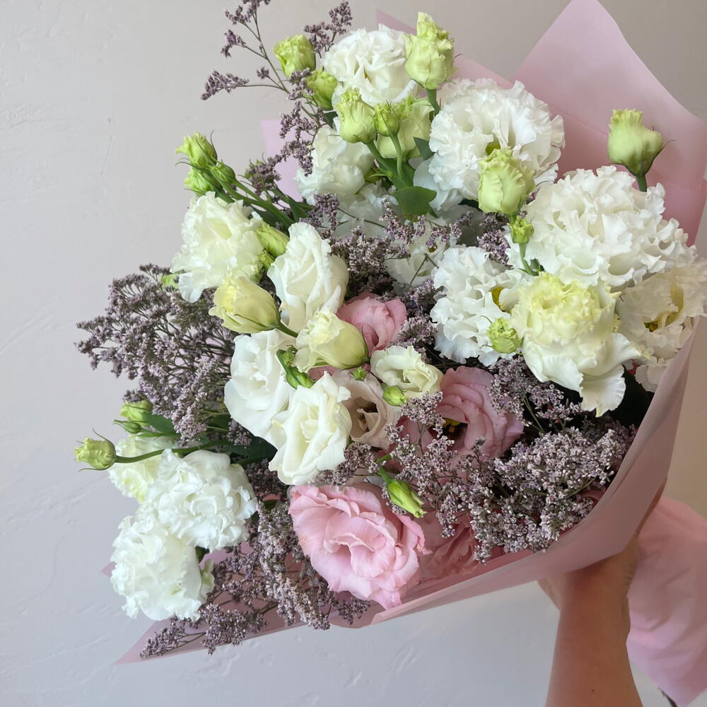 Puokštė nuotraukoje yra M dydžio. Įpakavimas įskaičiuotas į puokštės kainą. L - 11 eustomų, papildoma žaluma