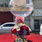 hortensias azules - 4 pce roses, variété de couleurs au choix - 10 pce Gerbera variedad de colores a elegir - 5 pce lili colores a elegir - 1 pce globo burbuja con dedicatoria - 1 pce chocolates ferrero rochar caja con 8 piezas - 1 pce