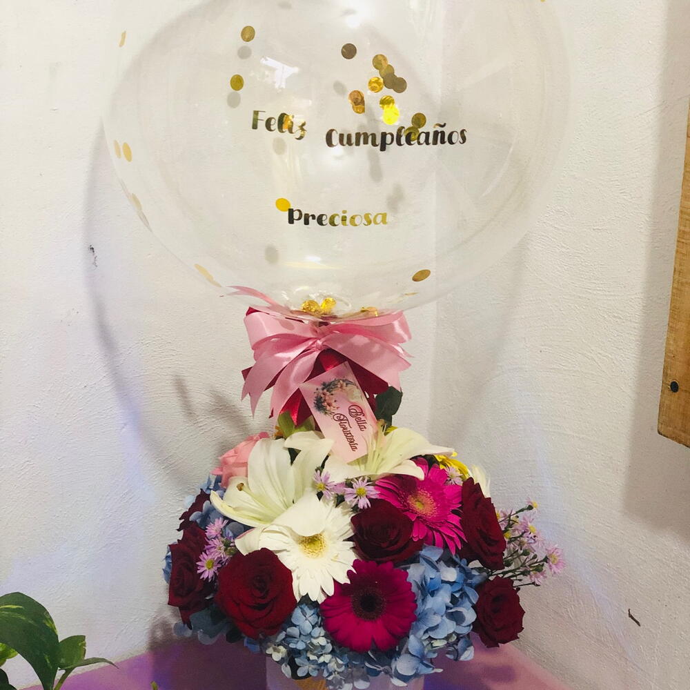 hortensias azules - 4 pce roses, variété de couleurs au choix - 10 pce Gerbera variedad de colores a elegir - 5 pce lili colores a elegir - 1 pce globo burbuja con dedicatoria - 1 pce chocolates ferrero rochar caja con 8 piezas - 1 pce