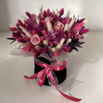 hortensia - 3 pce lagurus - 56 pce rose stabilisée - 3 pce eucalyptus parvifolia stabilisé - 8 pce rose stabilisée - 3 pce boîtes en velours - 1 pce fakatis - 35 pce