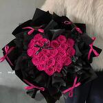 A breathtaking heart-shaped arrangement of vivid fuchsia roses, wrapped in dramatic black layers and adorned with matching pink ribbons. This statement bouquet symbolizes deep passion and devotion, making it the perfect gift for romantic milestones or unforgettable declarations of love. Bold, vibrant, and unforgettable.