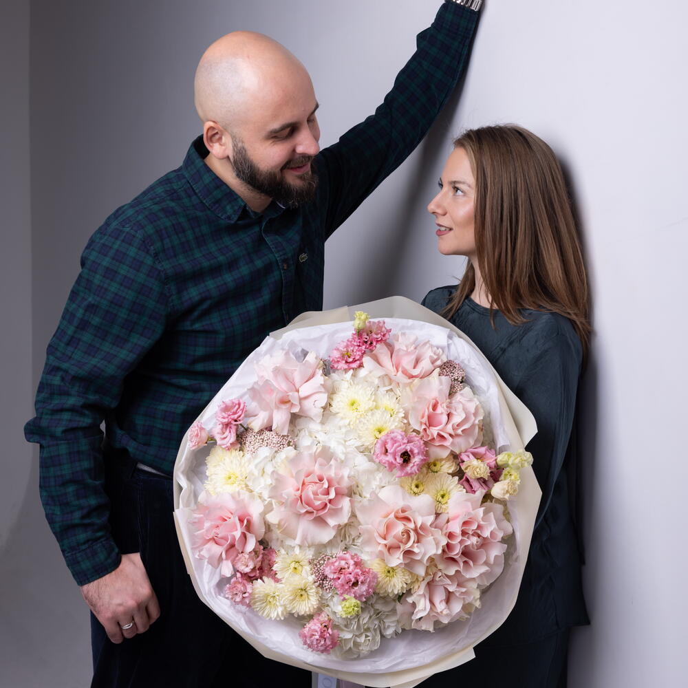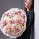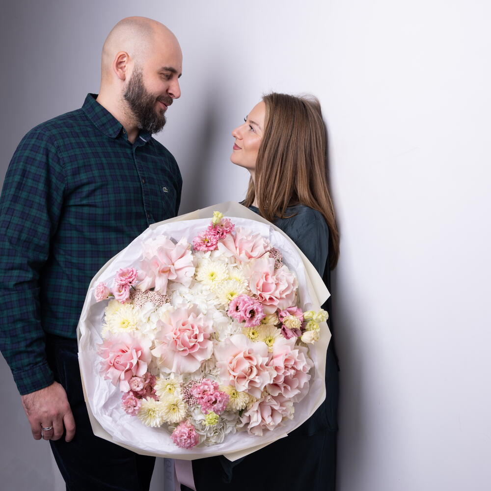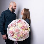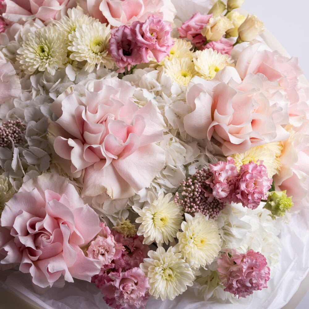 Bouquet Gentle Hug taille L (roses French Pink Mondial, fleur de riz, lisianthus, coussin, hortensias)