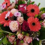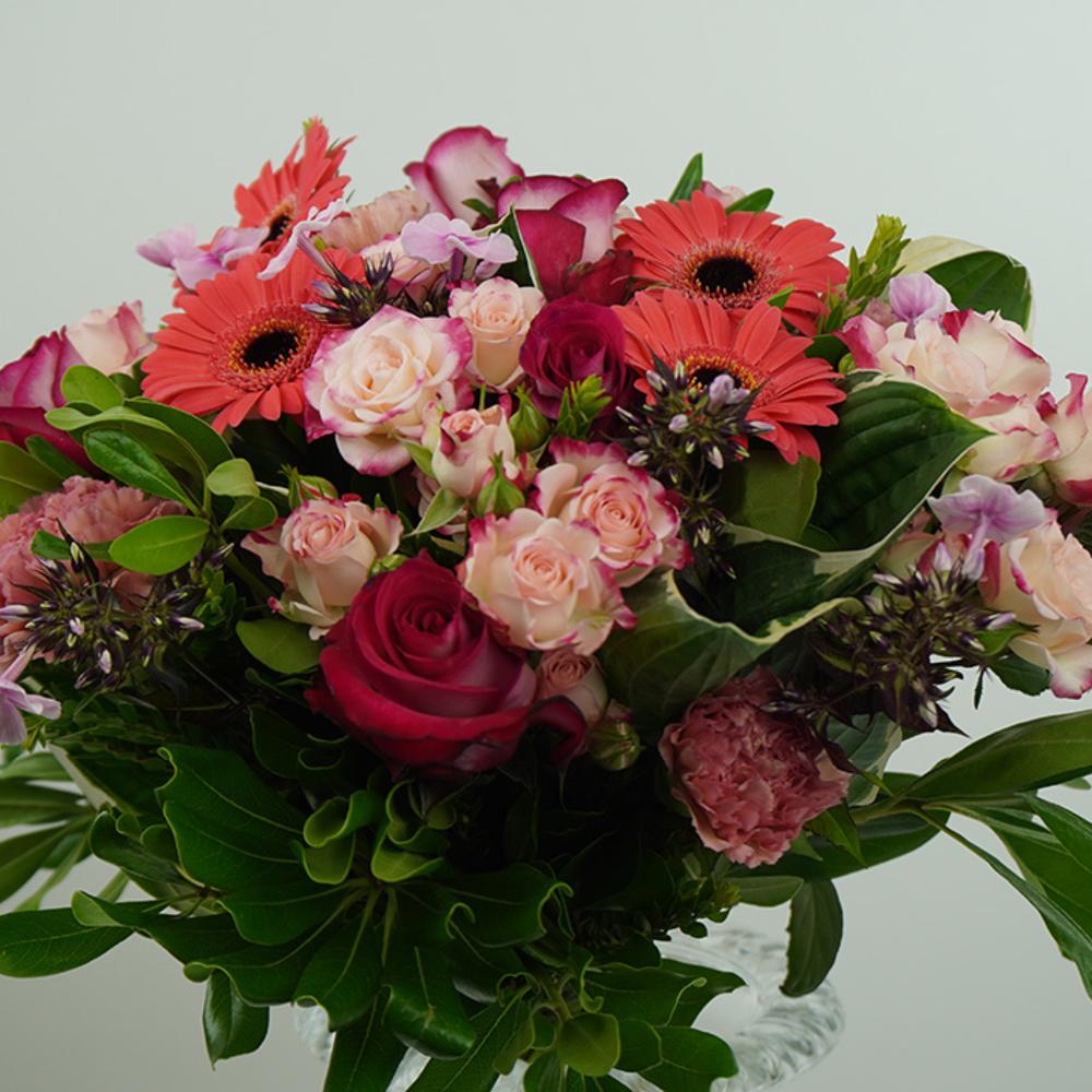 6 Roses 4 Gerberas 5 Polyantha Roses 5 Carnations 7 Phlox Various green Diameter 45 cm, height 45 cm