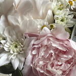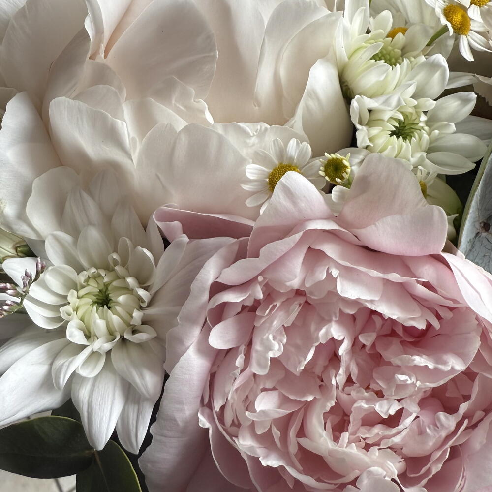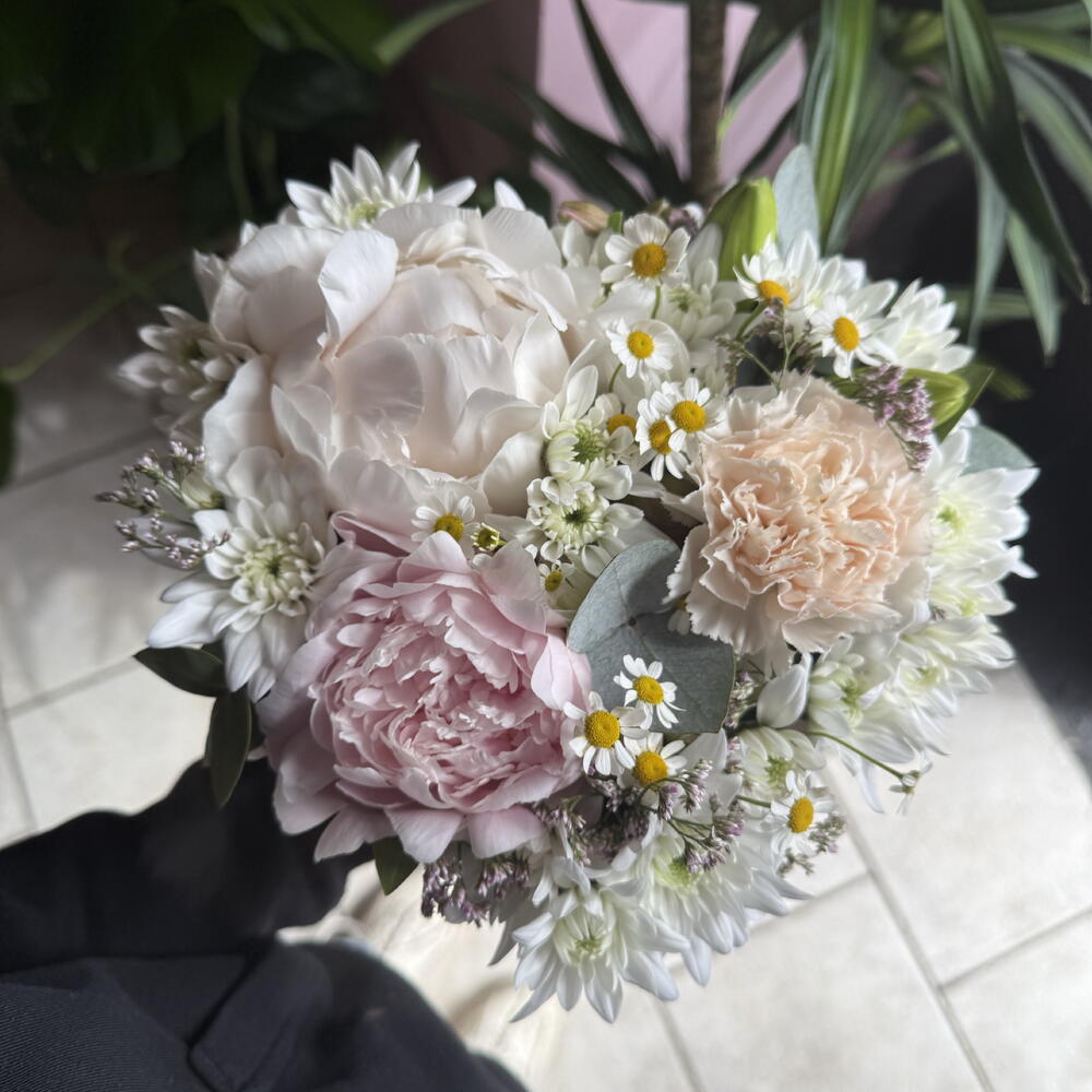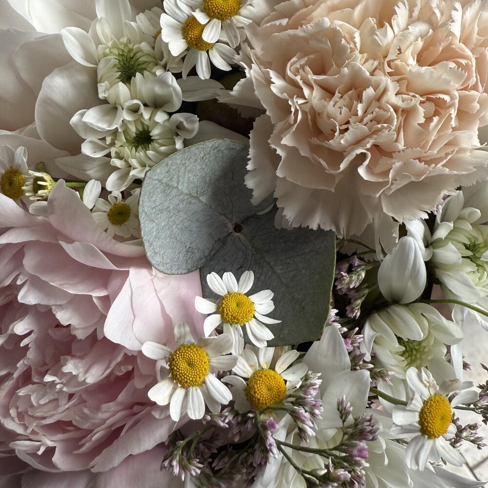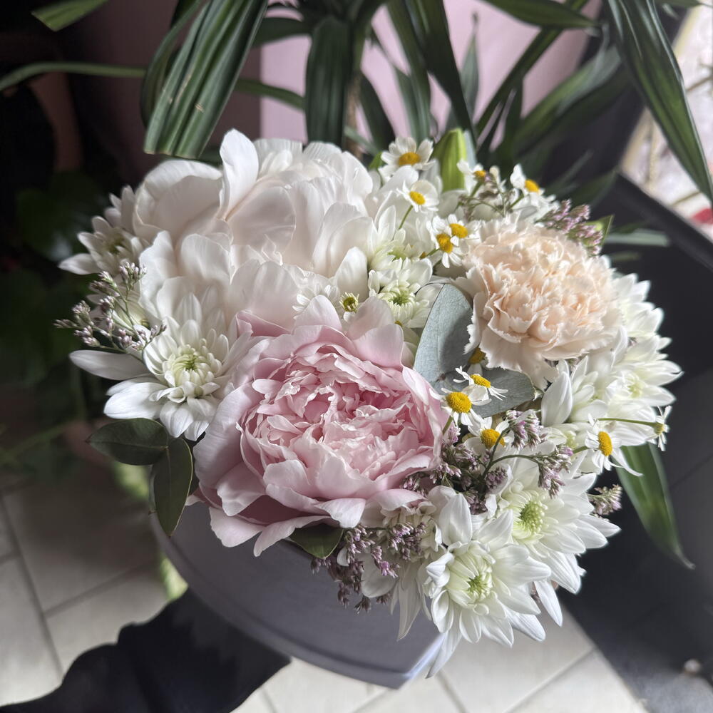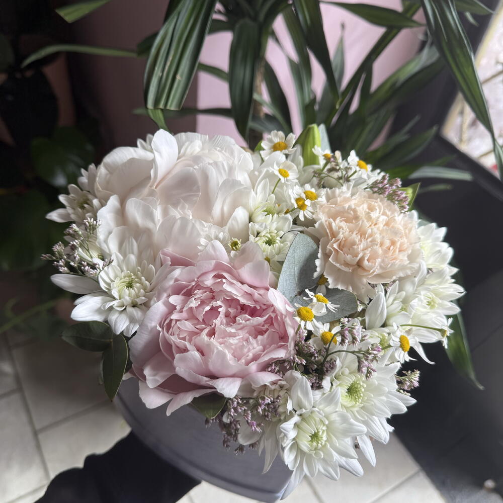 Eucalyptus - 3 pce Limonium - 1 pce alstroemère - 2 pce pivoine - 2 pce marguerite - 1 pce boîte - 1 pce mousse florale - 1 pce