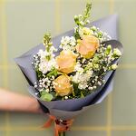 This captivating florists special features a calming blend of components, starting with 4 refreshing eucalyptus stems for a touch of greenery. Your eyes will be drawn to the 3 delicate gypsophila pieces, adding a hint of elegance to the arrangement. In addition, 3 mystic ornithogalum stems contribute to the floral symphony. The composition is further enriched by 4 serene white Matthiola which bring charm and serenity. Finally, 3 stunning Ecuadorian Mondial pink roses underscore the bouquet with their breathtaking beauty, perfect for expressing admiration and love. This composition radiates an enchanting aura that pleases the senses.