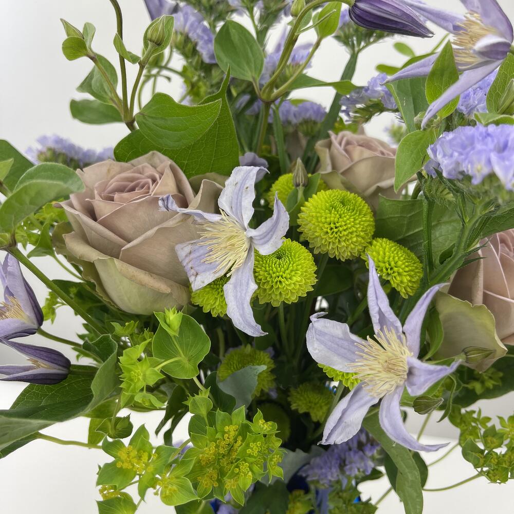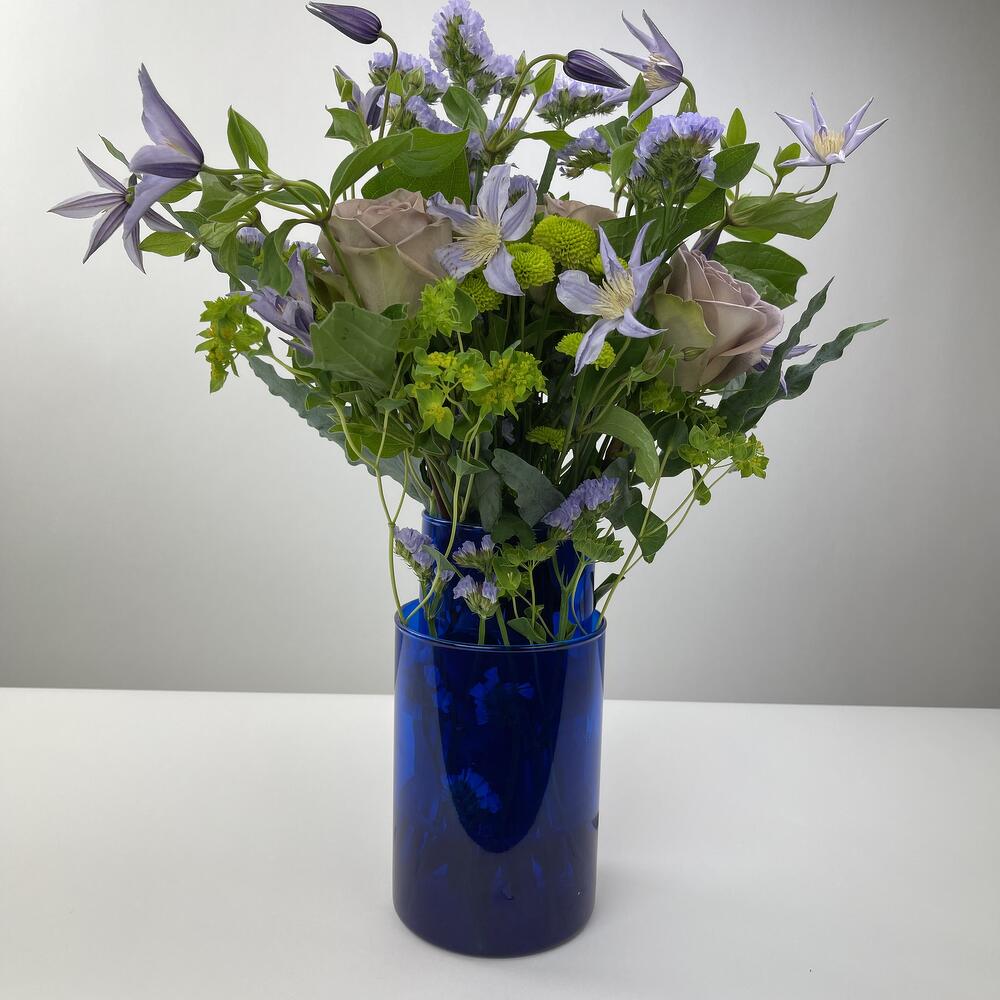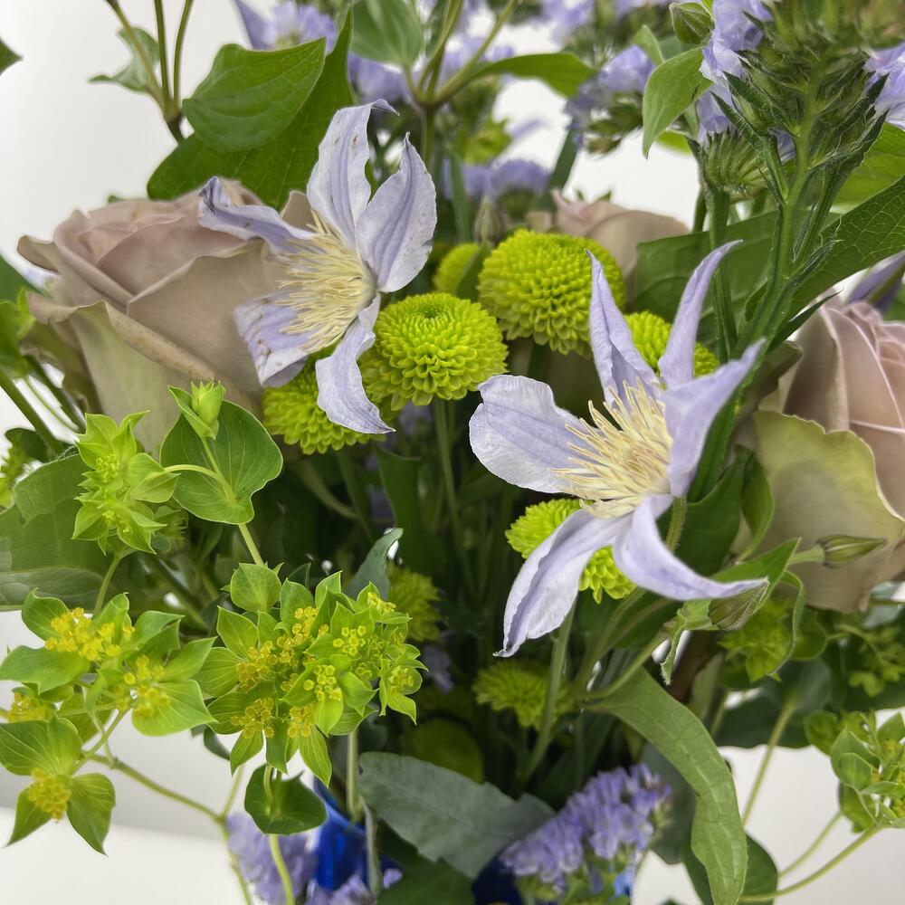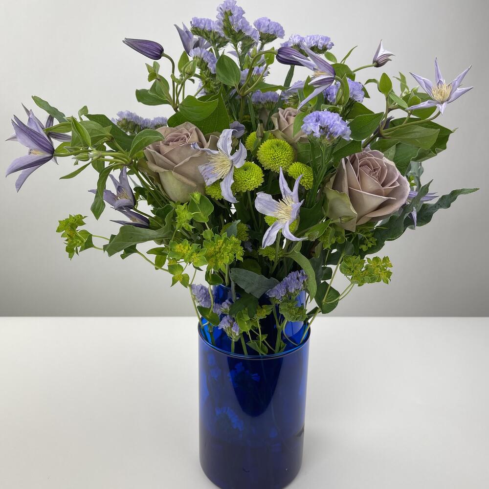 Design vase in vase Funny combination of flowers in blue vases. Roses, clematis, statize + accessories Diameter 40 cm, height 50 cm