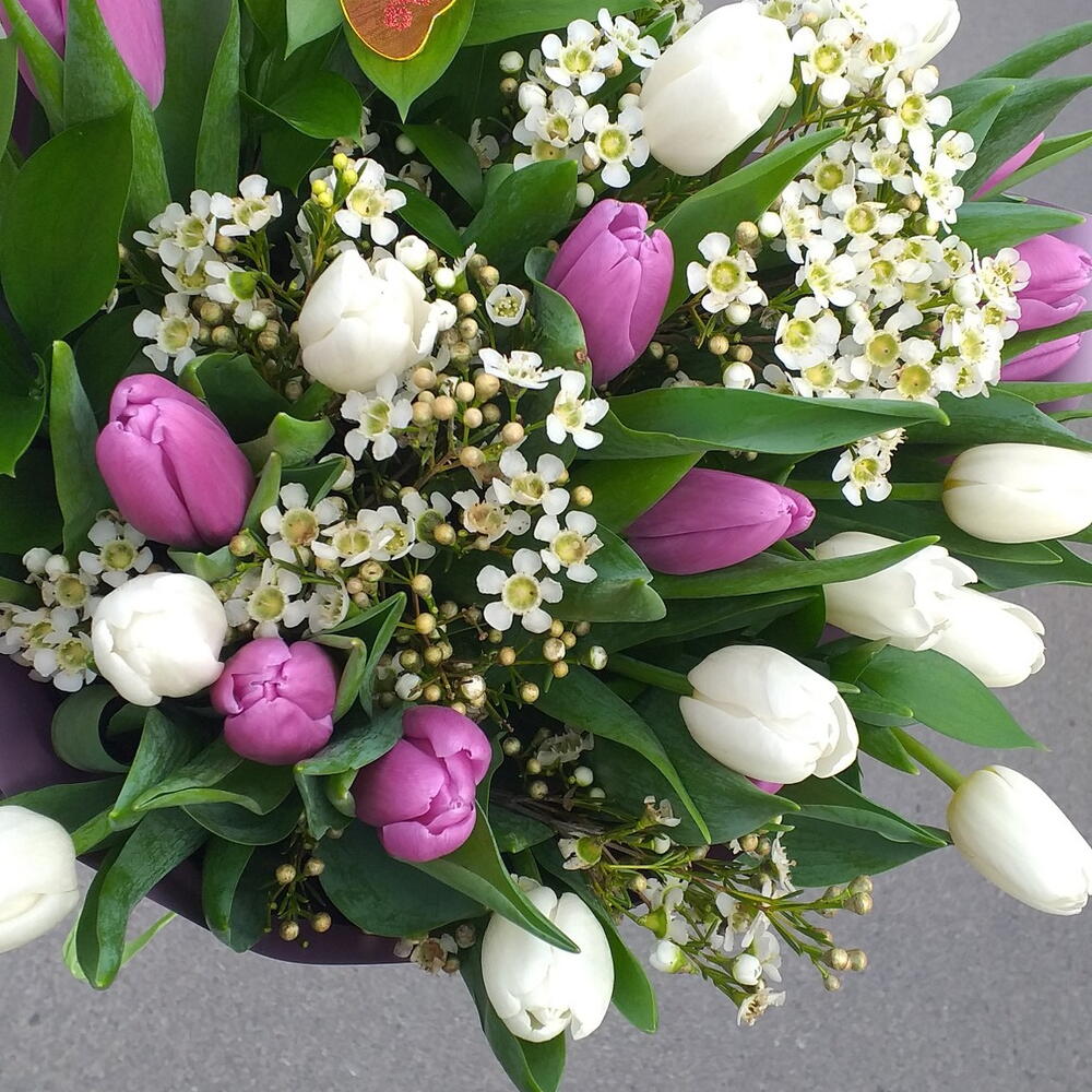 Un charmant bouquet printanier, empreint de légèreté et de charme naturel. De délicates tulipes blanches et roses composent une harmonie subtile, délicatement rehaussée d'une cire fine qui apporte fraîcheur et légèreté. Le feuillage vert luxuriant souligne le caractère naturel du bouquet, tandis que le papillon décoratif y ajoute une touche unique et joyeuse. Ce bouquet évoque un fragment de jardin printanier : frais, élégant et plein de vie. Idéal pour faire plaisir et offrir un avant-goût du printemps. Symboles : 🌷 Tulipes : joie, chaleur et sincérité 🦋 Papillon : bonheur, transformation et nouveau départ Parfait pour : La Journée de la femme, un anniversaire, une fête, dire merci ou simplement se faire plaisir au printemps