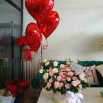 A ready-made gift that requires no extras: a stylish flower arrangement in a basket and striking heart-shaped balloons. An excellent choice for a declaration of love, a birthday, or a surprise for any occasion.