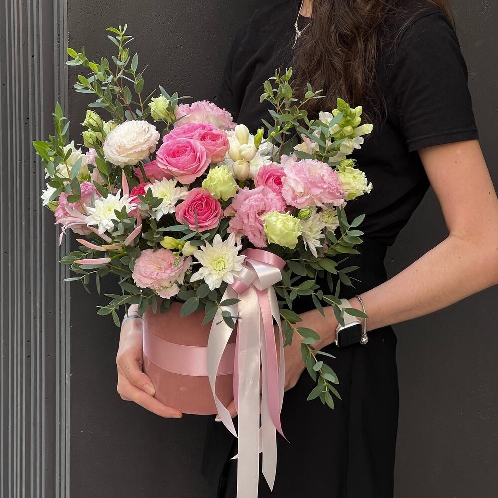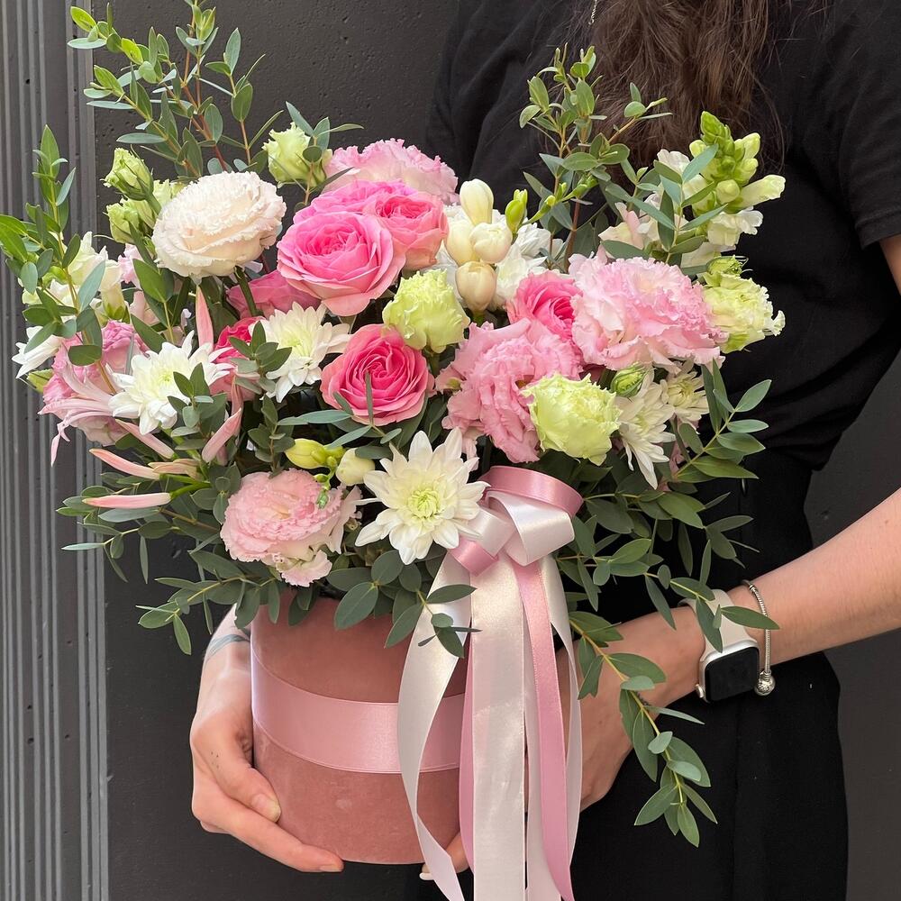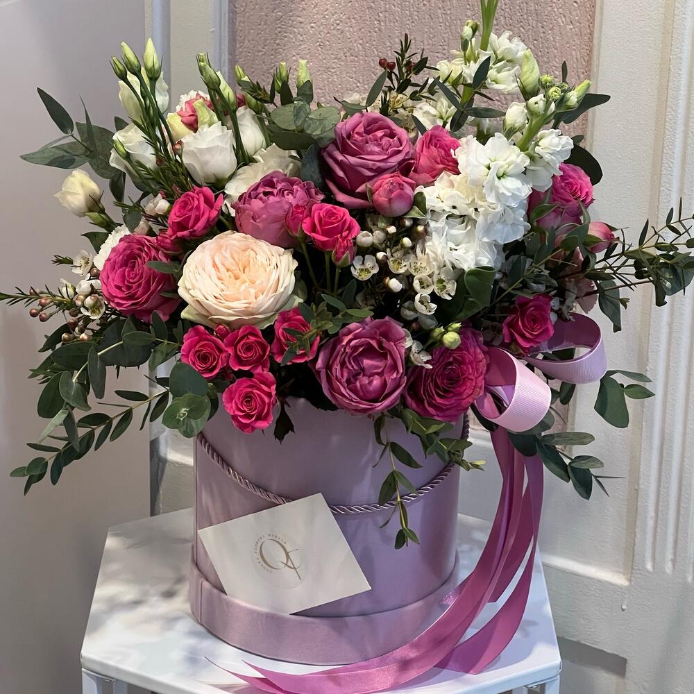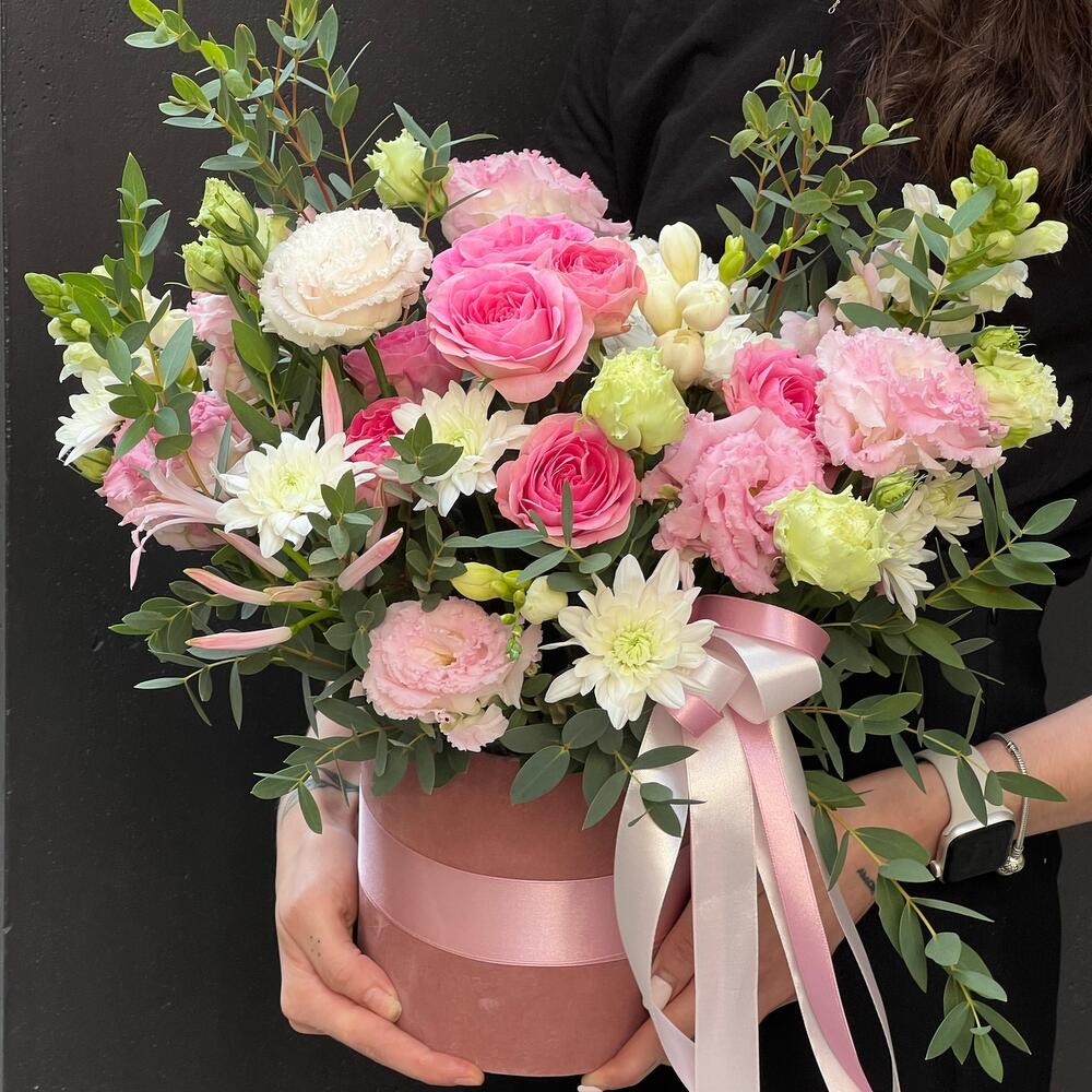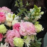 Eustoma - 4 pce Spray rose - 2 pce Chrysanthemum - 2 pce frésia - 5 pce eukalyptus - 3 pce gueule de lion - 2 pce