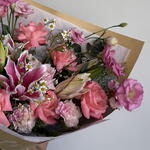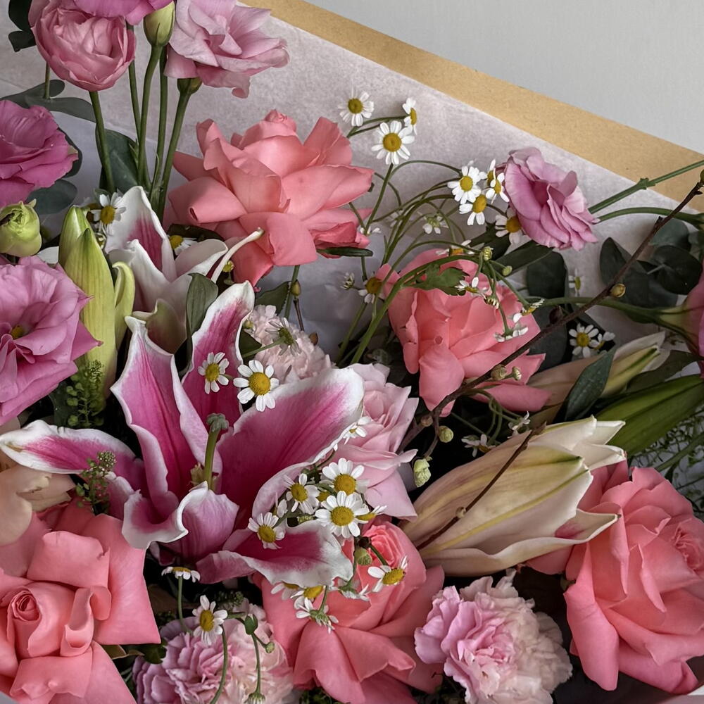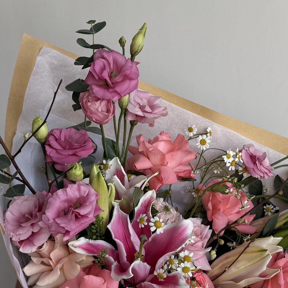 Eucalyptus - 2 pce Lisianthus - 5 pce Lys - 3 pce camomille - 2 pce œillets - 3 pce rose - 7 pce œillets spray - 2 pce branches décoratives - 2 pce