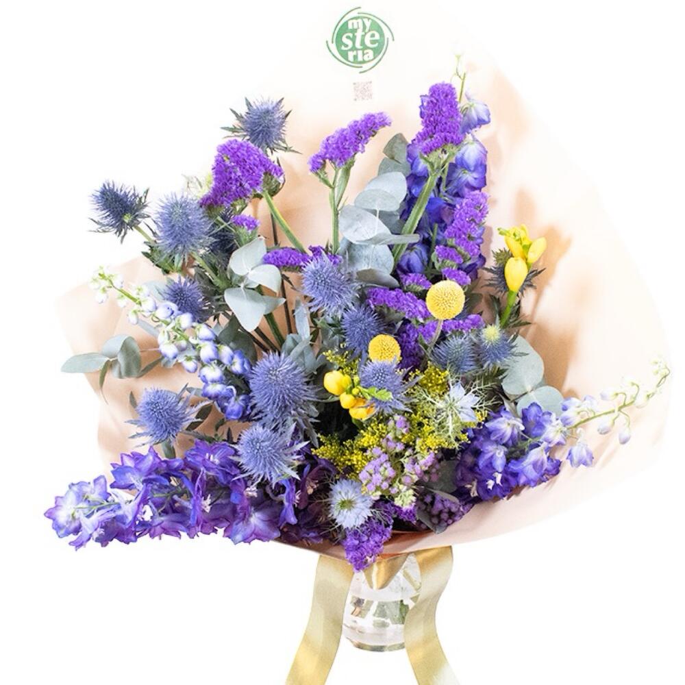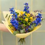 Indulge in the exquisite beauty of our Florists Specials. This magnificent arrangement features a splendid mix of flowers: 3 lavish sprigs of Eucalyptus, 3 delicate stems of Limonium, 3 vibrant Solidago sprigs, 4 whimsical stalks of Craspedia, and 3 enchanting Eryngium blue blooms. As a crowning glory, weve added 5 striking Delfinium stems. This assortment captures a captivating blend of textures and colours, making it a perfect choice to brighten up special occasions or simply to bring natures masterpiece into your home.