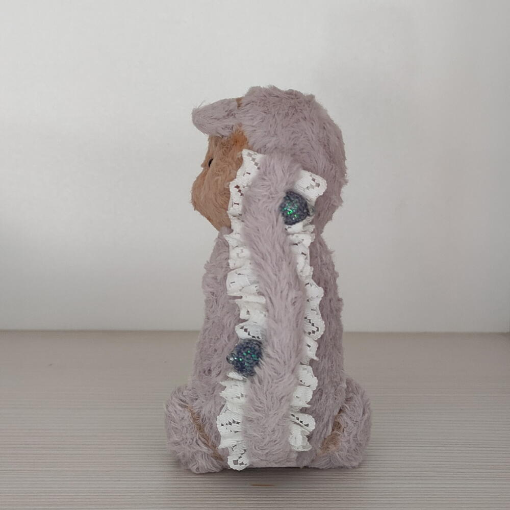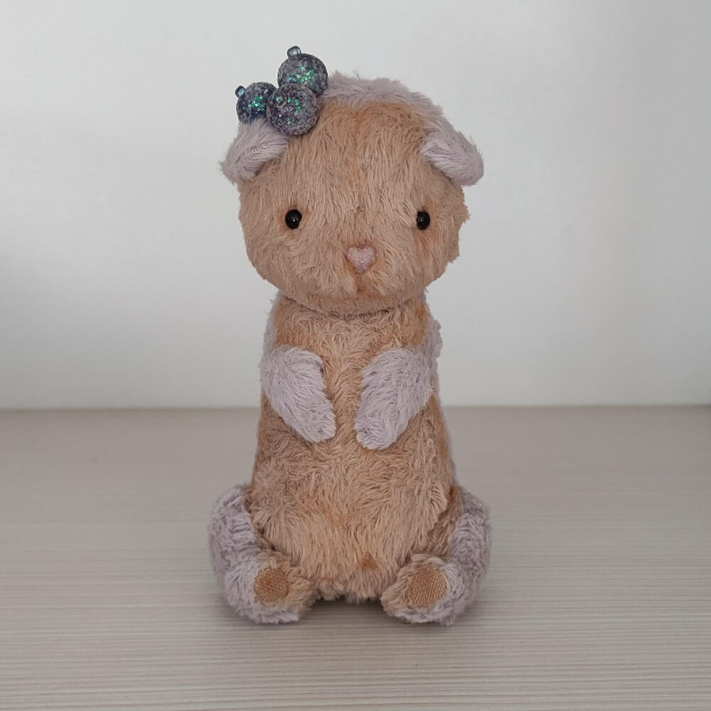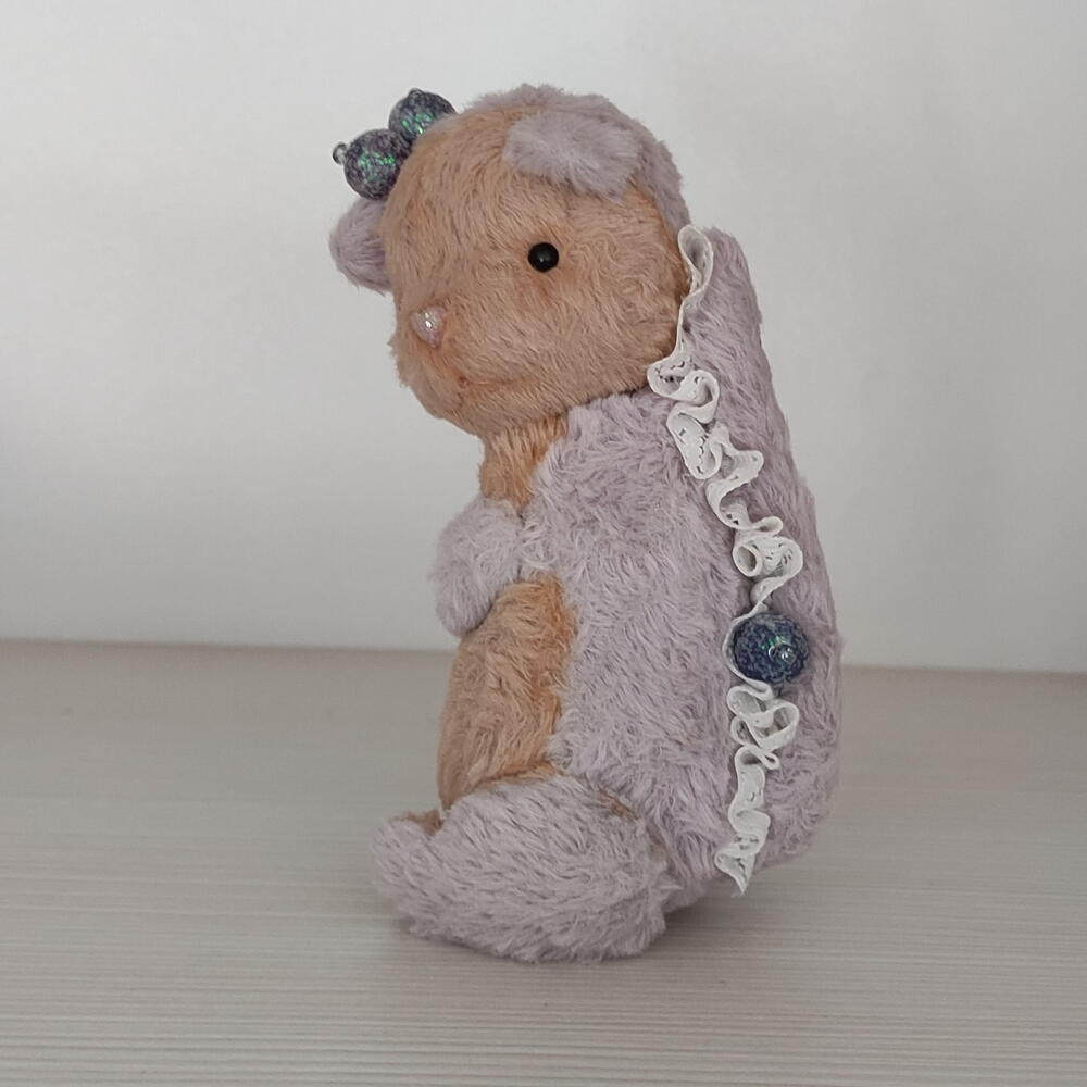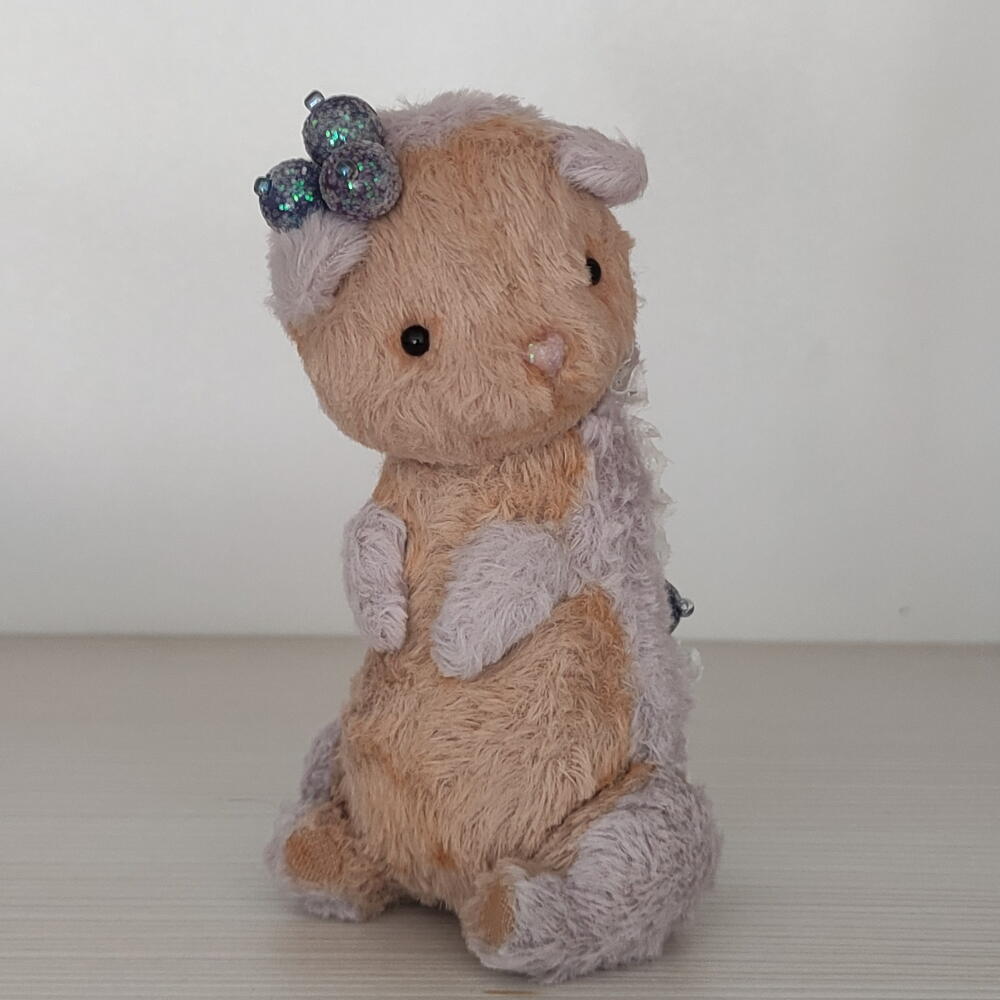 Interior toy, made of German viscose, stuffed with cedar sawdust, has granules for weighting, glass eyes. Paws and head turn. Requires careful handling, do not store in direct sunlight, avoid contact with water. Remove small dirt with a damp cloth.