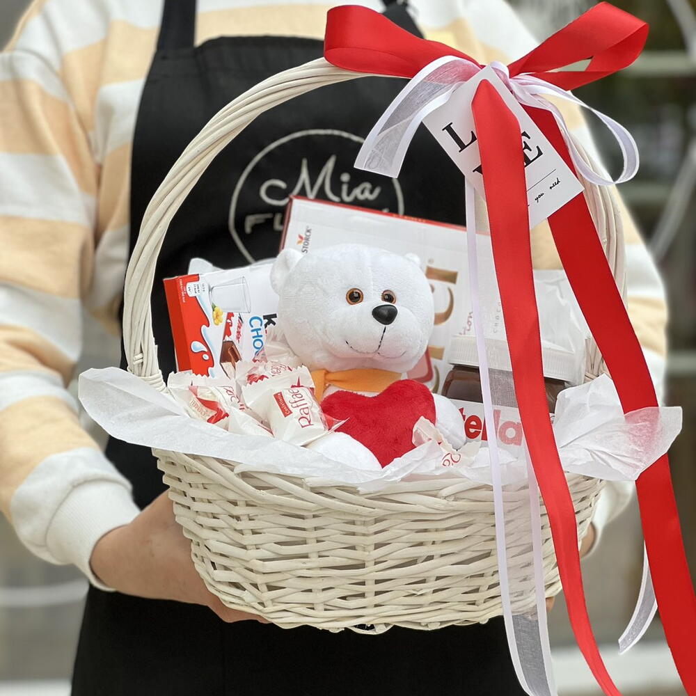 коробка раффаэлло 150 гр - 1 pce молочный батончик kinder chocolate - 8 pce шоколад merci - 250 гр. - 1 pce нутелла 400 гр. - 1 pce мягкая игрушка мишка с сердцем - 20 см - 1 pce