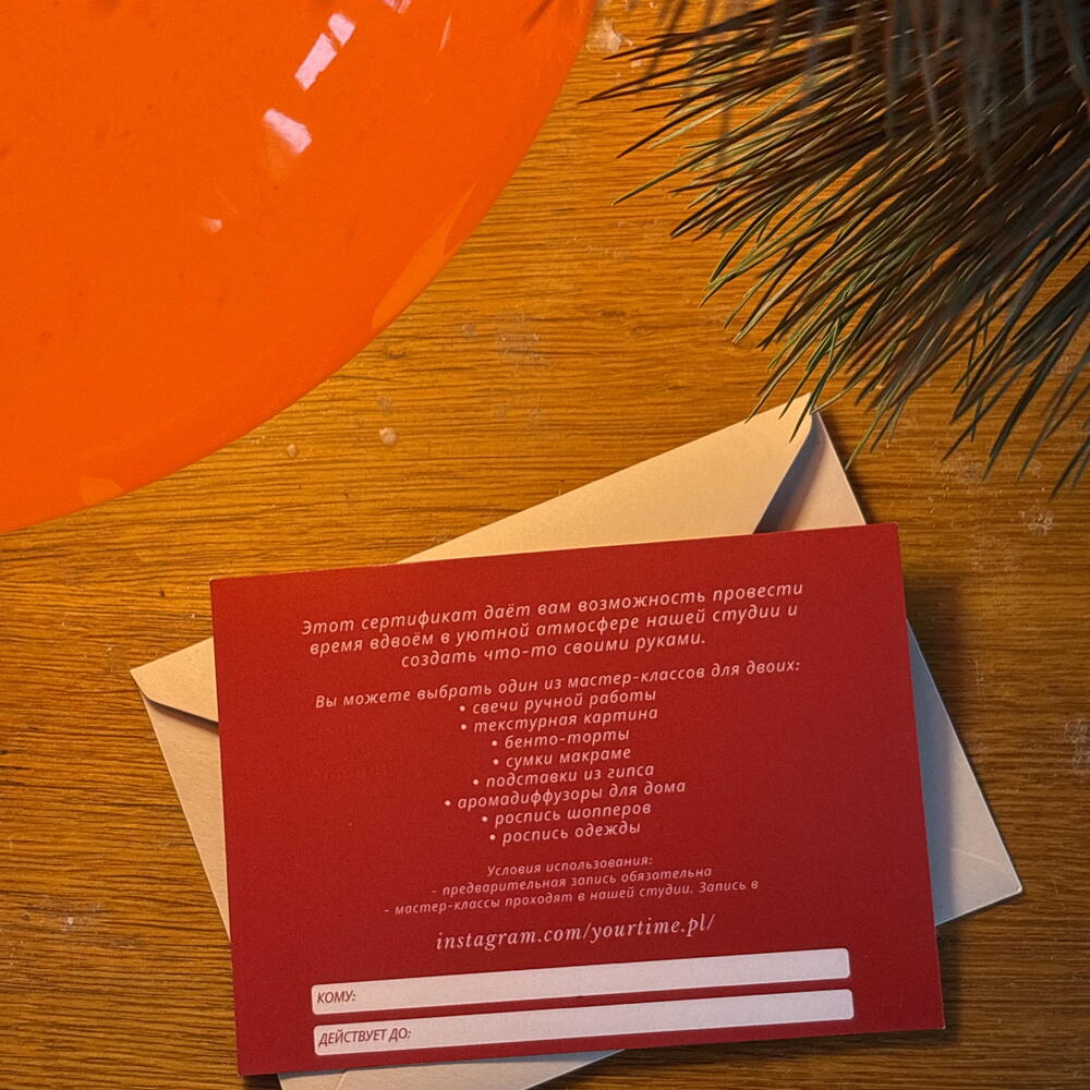 Voucher for an artistic date for two A private session just for the two of you in our studio: ✨ approx. 2 hours of creative work ✨ any workshop of your choice ✨ all materials included ✨ instructor support at every stage ✨ each participant creates their own finished piece You can choose any format: • soy wax candles and aroma sachets • scent diffusers for the home • paintings (textured, with affirmations, or on any subject) • macramé bags • painting tote bags • plaster coasters 📅 Date and time are scheduled individually, according to your availability. 🎁 The voucher is valid for 6 months. This voucher is not only a gift. It's an invitation to spend time together and create beautiful memories 🤍