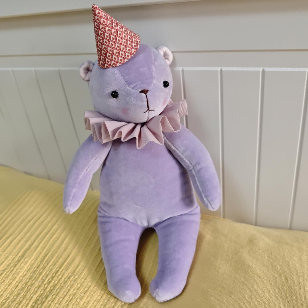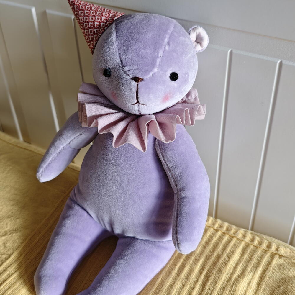An interior toy. The head is sewn from velour and the upper legs are movable. The eyes are made of beads. Suitable for children ages 6 and up.