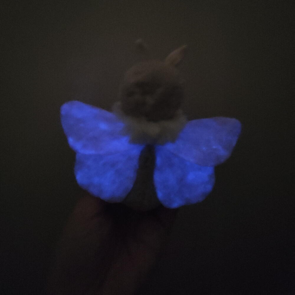 Interior toy, not intended for children. Made of artificial fur and polymer clay, paws move. Fragile, do not injure! if you fill it well with light the wings glow a little blue in the dark