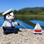Interior toy, made of German viscose, stuffed with cedar sawdust, has granules for weighting, glass eyes. Paws and head turn. Requires careful handling, do not store in direct sunlight, avoid contact with water. Remove small dirt with a damp cloth.