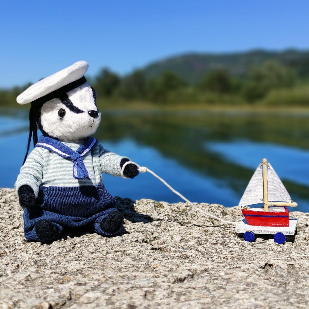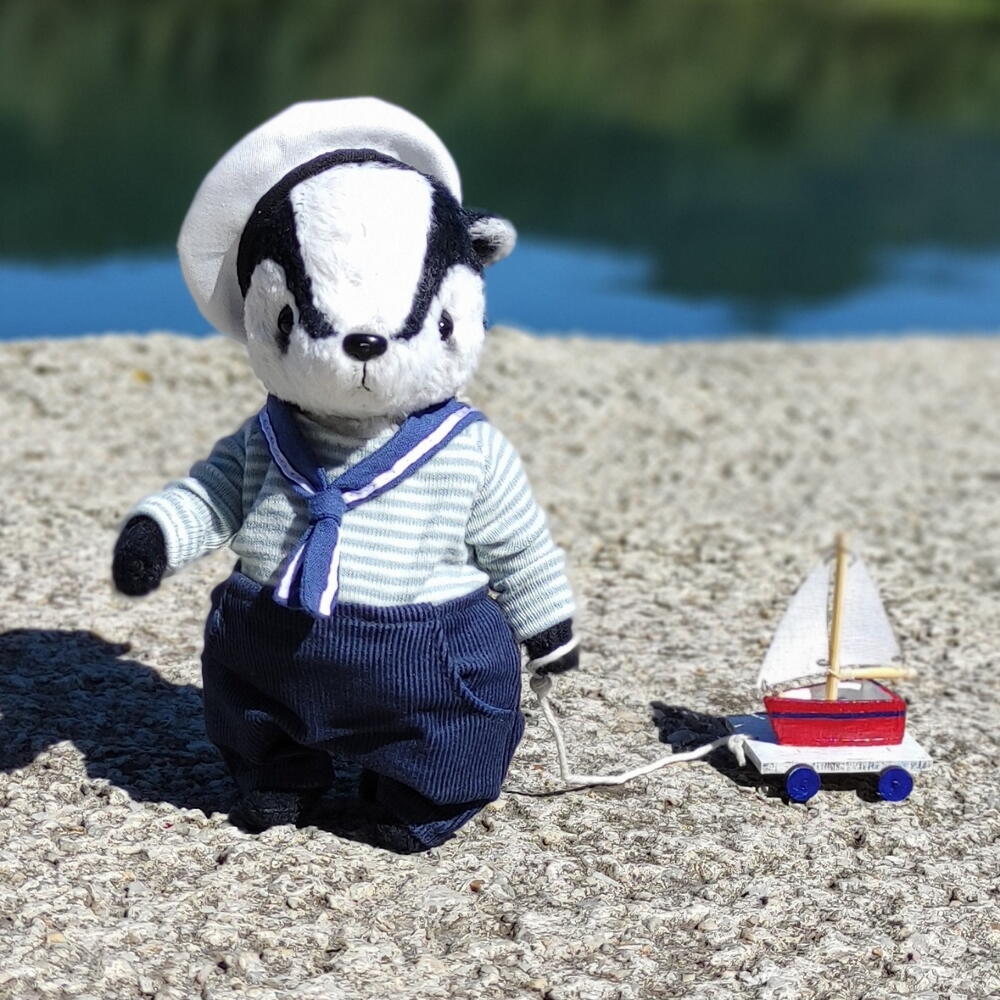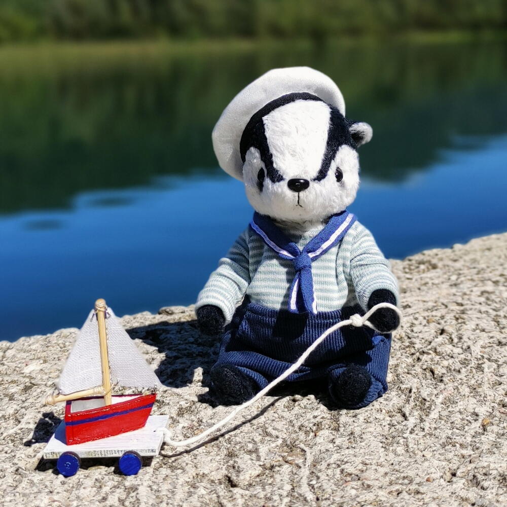 Interior toy, made of German viscose, stuffed with cedar sawdust, has granules for weighting, glass eyes. Paws and head turn. Requires careful handling, do not store in direct sunlight, avoid contact with water. Remove small dirt with a damp cloth.
