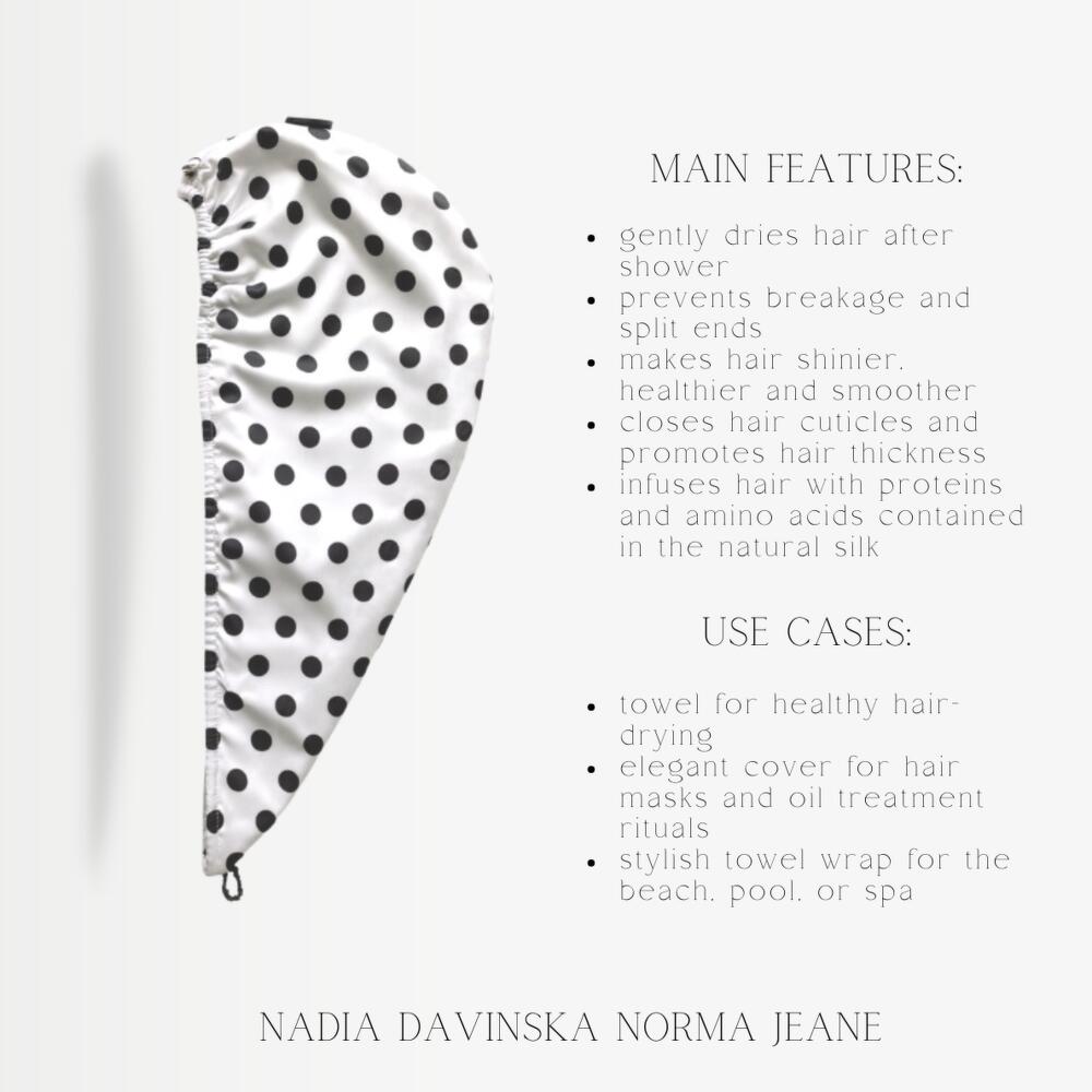 Nadia Davinska turban is a luxurious bound-to-charm gift that will bring you many happy moments of self care rituals. While being a stylish hair accessory, Nadia Davinska turban is, first of all, a comfortable and HEALTHY solution for hair drying. Its two main functions: 1) dry your hair with care and comfort. 2) improve your hair quality. Our mission is to win back those precious minutes of your life usually spent fighting your soaking hair. Focus on what matters the most while your hair is drying fast, safe, and heals with natural silk. Lining: 100% Natural Mulberry Silk 22 Momme 6A Grade Middle layer: Microfiber of premium quality Upper layer/shell: Luxe satin to offer you a variety of chic and stylish colors. Turban details: Satin-wrapped elastic loop; Metallic button; Tight elastic on the turbans edge; Silk pocket for wet hair inside