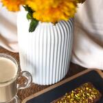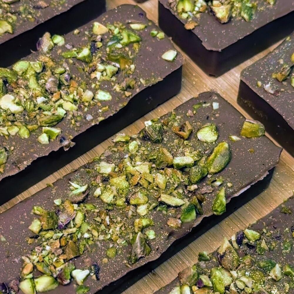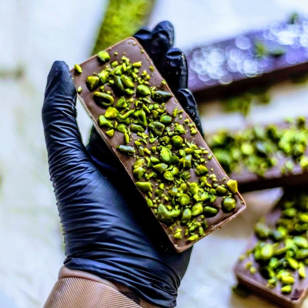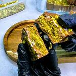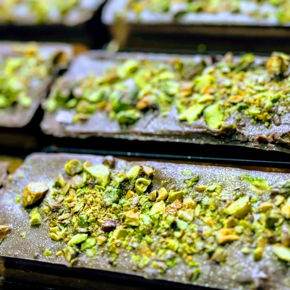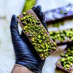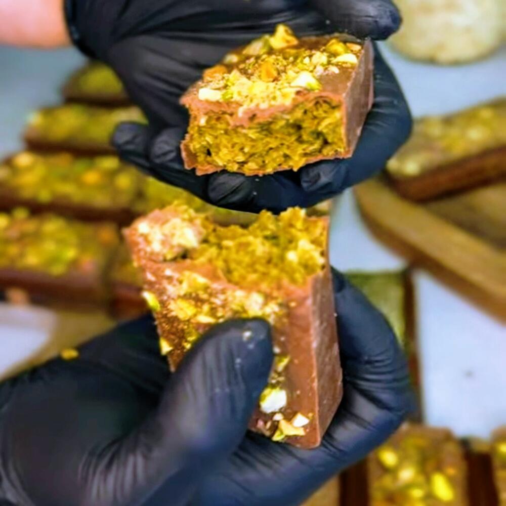 Piena šokolāde, kataifi mīkla, pistāciju pasta, sezama pasta, pistācijas, rieksti. Milk chocolate, kataifi dough, pistachio paste, sesame paste, pistachios, nuts