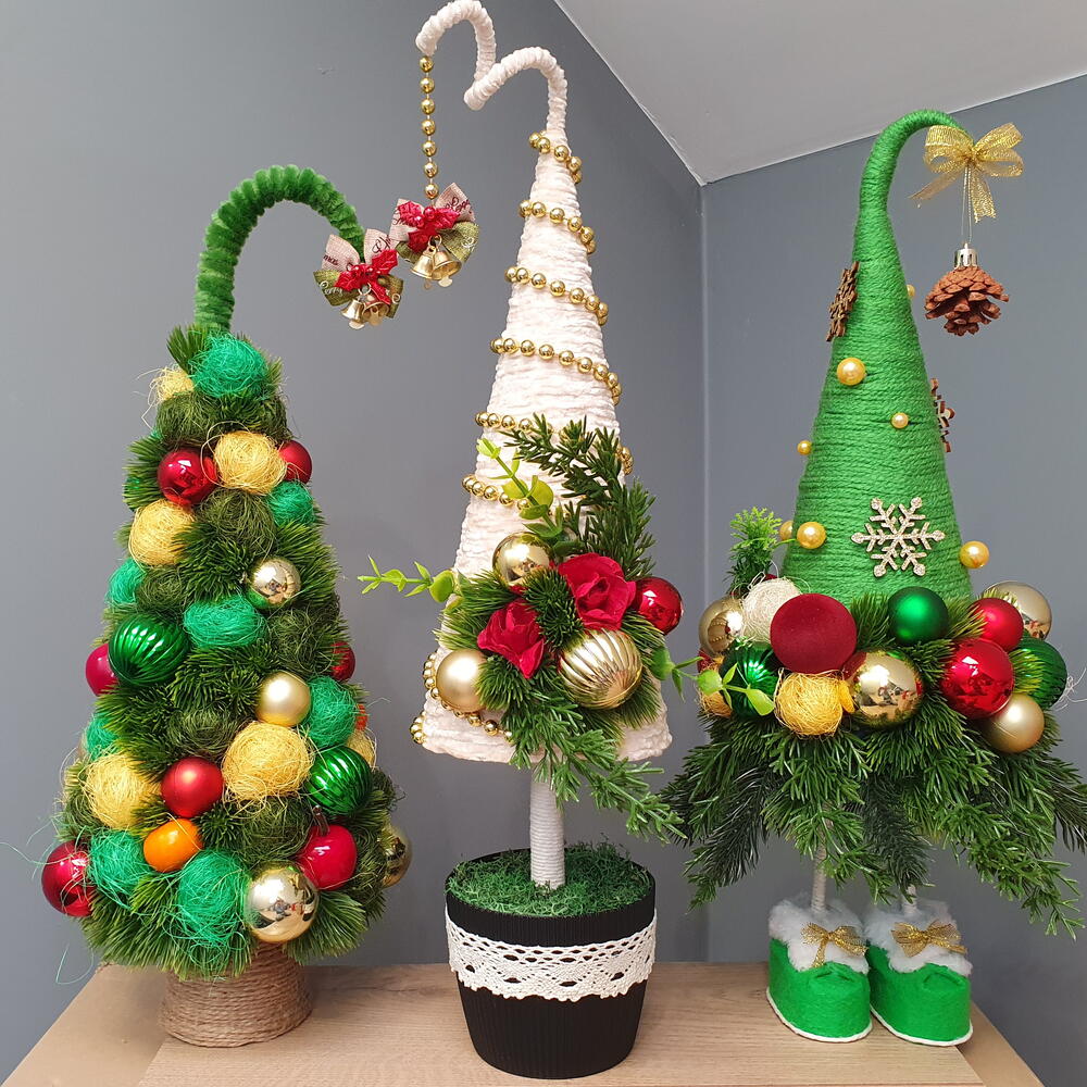 Minden karácsonyfa nagy gondossággal készült. 🎁 Ideális: • ünnepi dekoráció otthonra vagy irodába • ajándék egy közeli személynek • dísz az ünnepi asztalra, komódra vagy vitrinre ✨ Kiemelkedik: ✔ gazdagon díszített díszek ✔ divatos, modern, skandináv stílusú kivitelezés ✔ stabil szerkezet ✔ különleges – minden darab egyedi! Magasság: 45–52 cm. Állapot: új, kézzel készített. 💚 Ezek gyönyörű, otthonos díszek, amelyek igazán ünnepi hangulatot teremtenek – azonnal felkeltik a vendégek figyelmét!