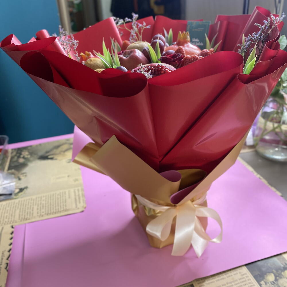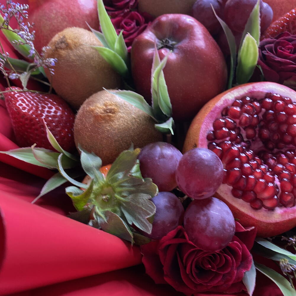 apples - 5 db. kiwi - 4 db. grapes - 150 g eper - 300 g csomagolópapír - 3 db. card - 1 db. gránátalma - 3 db. rózsák - 5 db.