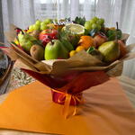 csomagolás - 1 db. grapefruit - 1 db. grape - 200 g kiwi - 10 db. pear - 7 db. alma - 5 db. narancssárga - 3 db. tangerine - 5 db. gránátalma - 1 db. card with your wishes - 1 db. sarin ribbon - 1 db. black currant - 100 g