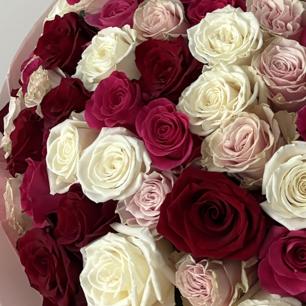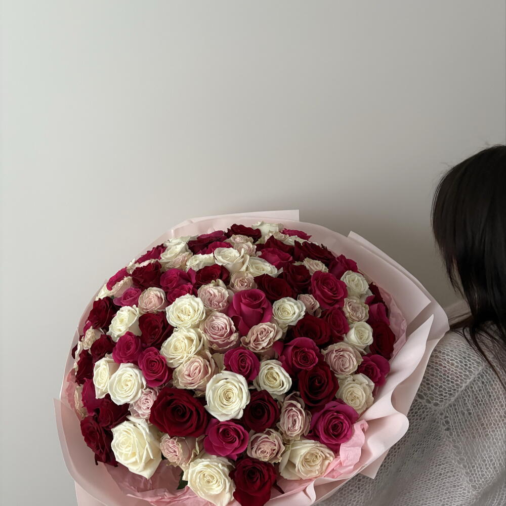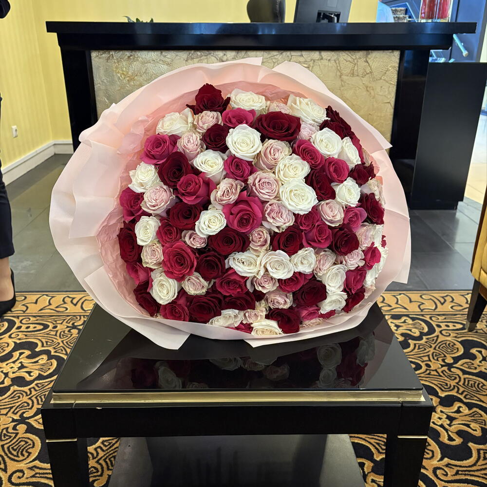 An exquisite bouquet of 101 premium roses in a beautiful blend of red, soft pink, and creamy white tones. Rich in elegance and symbolism, this stunning arrangement expresses love, admiration, and heartfelt emotions, making it a perfect choice for unforgettable moments and grand celebrations.