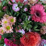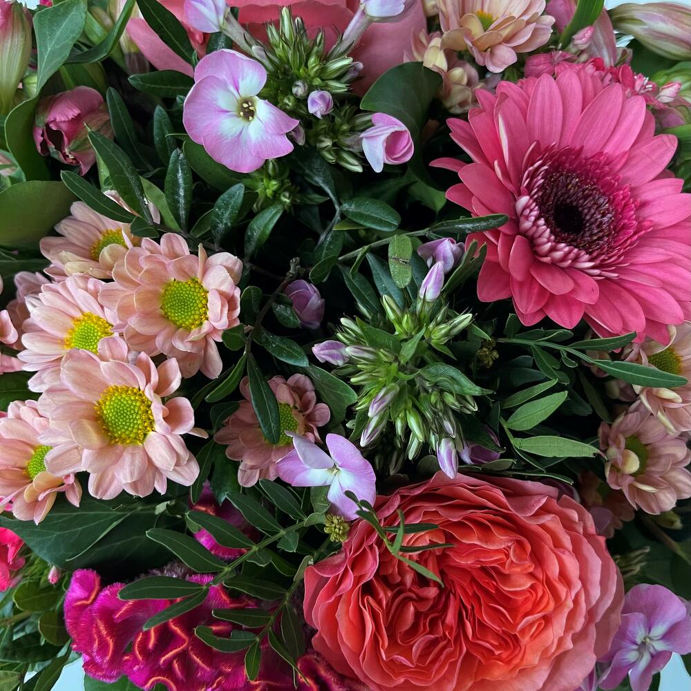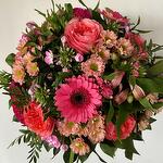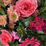 Flowers : 5x roses 3x gerberas 5x crysanthemums 5x carnations 3x alstromerias 5x phlox 3x celosia + green Diameter : 38 cm Colours : pink