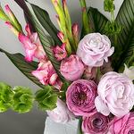 Zöld növényzet - 1 db. ranunkulusz - 4 db. amarantusz - 4 db. kálák - 5 db. kerti rózsák - 5 db. ír harangok - 3 db. kardvirágok - 4 db. phelonapsas - 1 db.