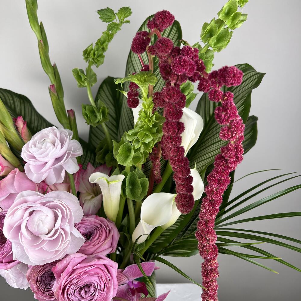 Zöld növényzet - 1 db. ranunkulusz - 4 db. amarantusz - 4 db. kálák - 5 db. kerti rózsák - 5 db. ír harangok - 3 db. kardvirágok - 4 db. phelonapsas - 1 db.