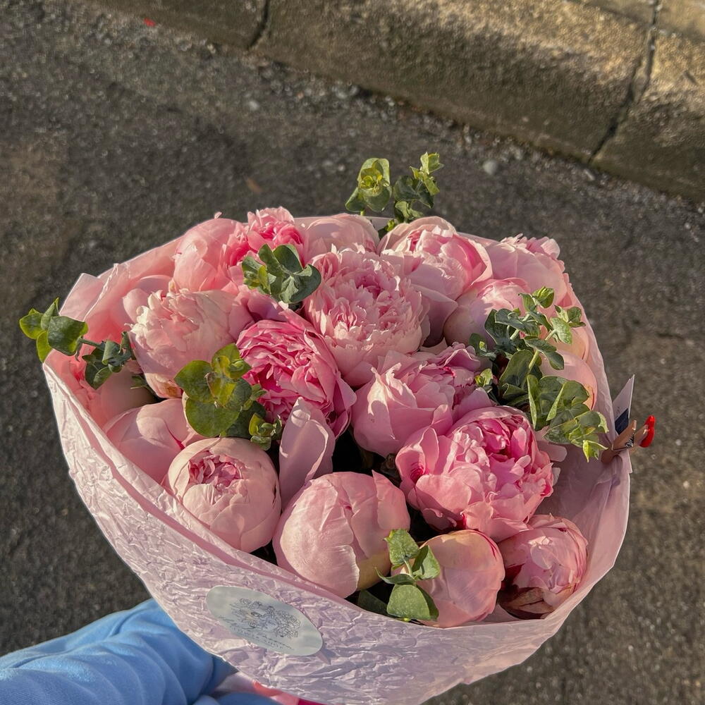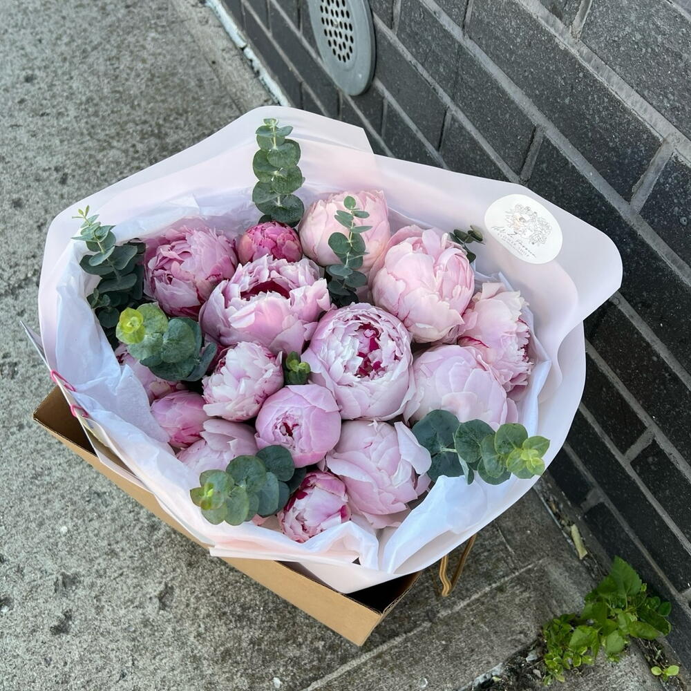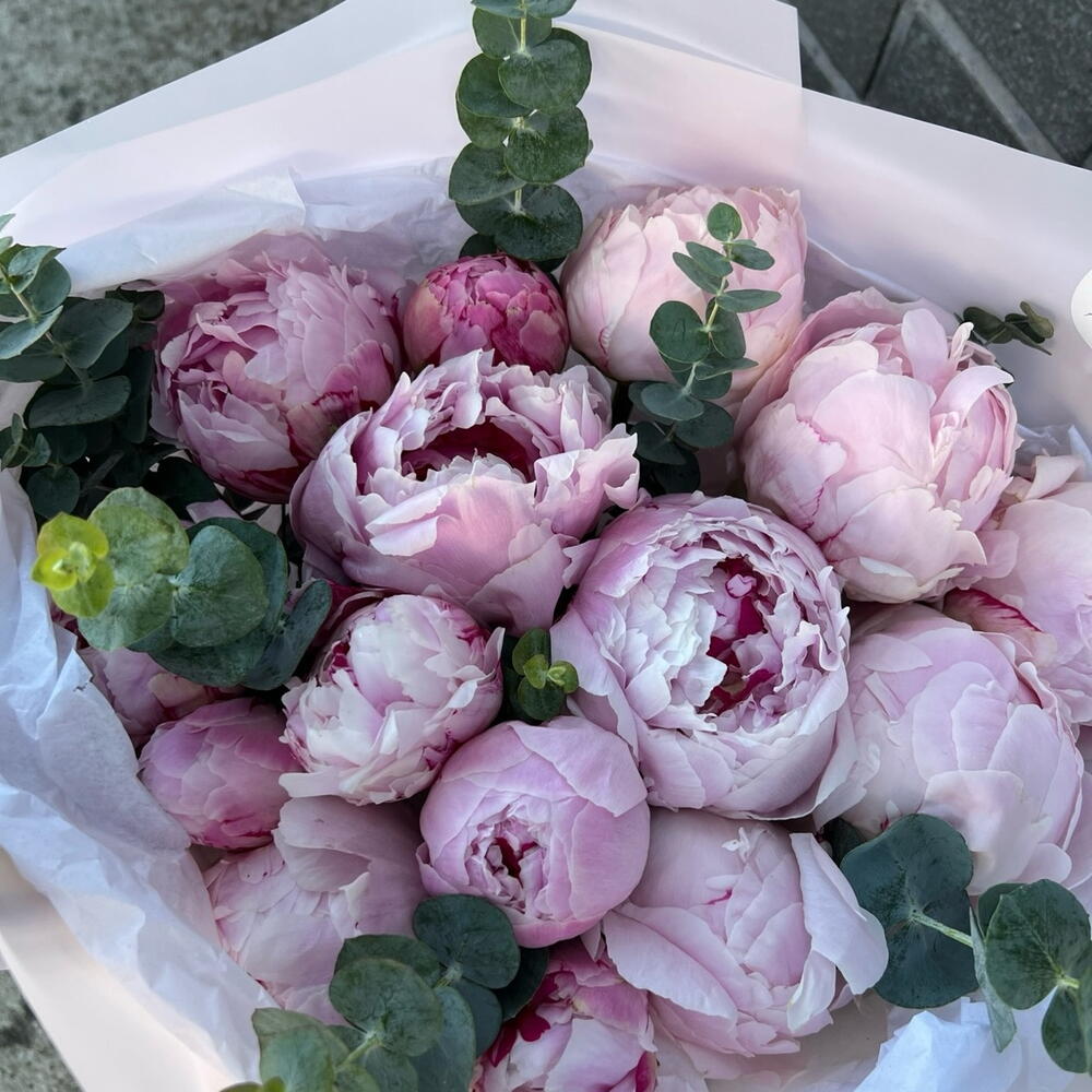 Peonies may be smaller or bigger depending of the season. The photo just rolls the ratio of colors between each other and the design of the arrangement The magical combination of pink peonies and eucalyptus will conquer any heart. Just look at this stunning combo of stunning large peonies and eucalyptus, which we simply and neatly emphasized with wrapping paper and colored ribbon. Add to favorite to not lose! HOW TO CARE OF FLOWERS? Do not remove the wrapping paper from the bouquet, so then flowers will live longer Change the cold water in a vase every day Keep the vase clean Cut the stem of each flower every two days Keep the bouquet out of a direct sun, drafts and heaters Add the flower food 2-3 days after you’ve bought your bouquet (We add the flower food to every bouquet)