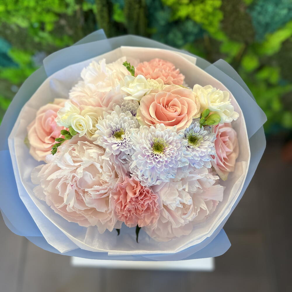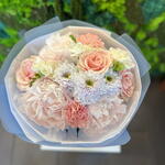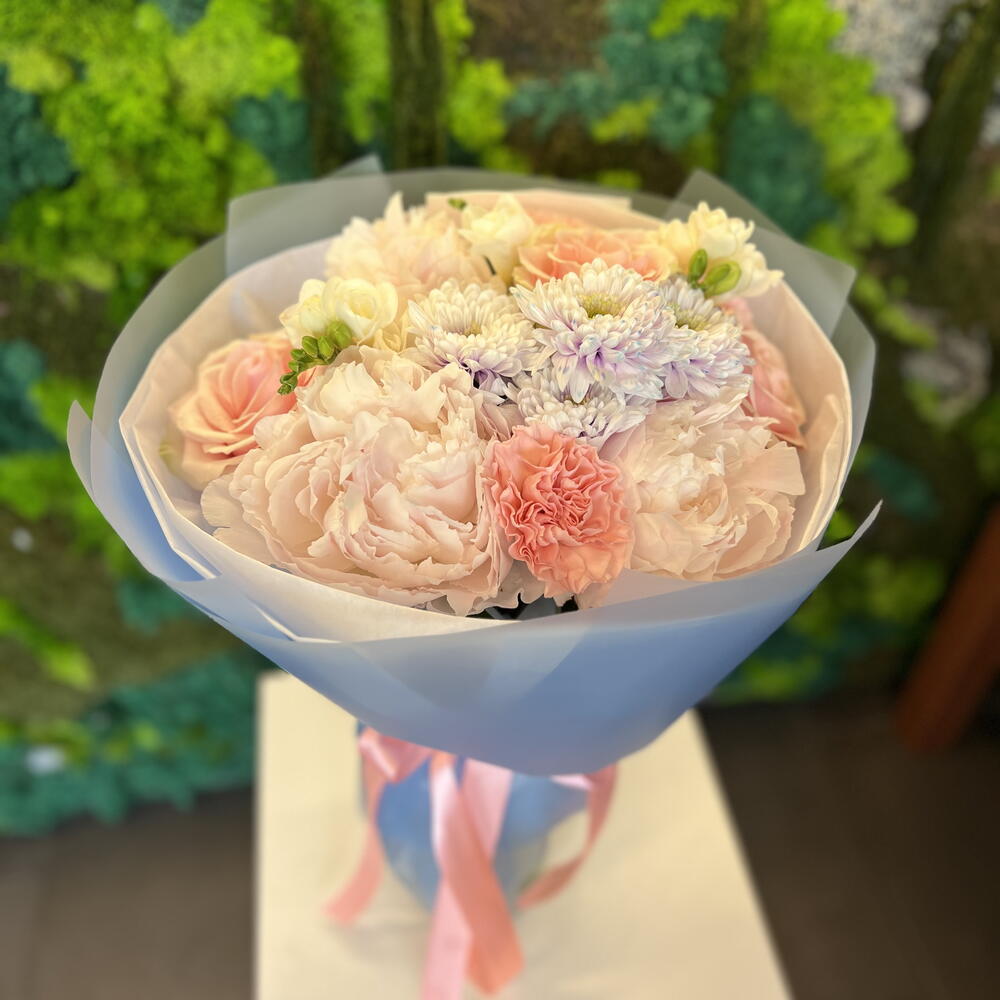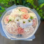 Krizantém - 1 db. Frézia - 3 db. szegfű csokor - 3 db. rózsa - 3 db. rózsaszín bazsarózsa - 3 db.
