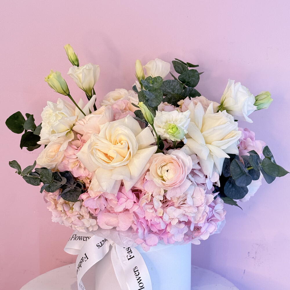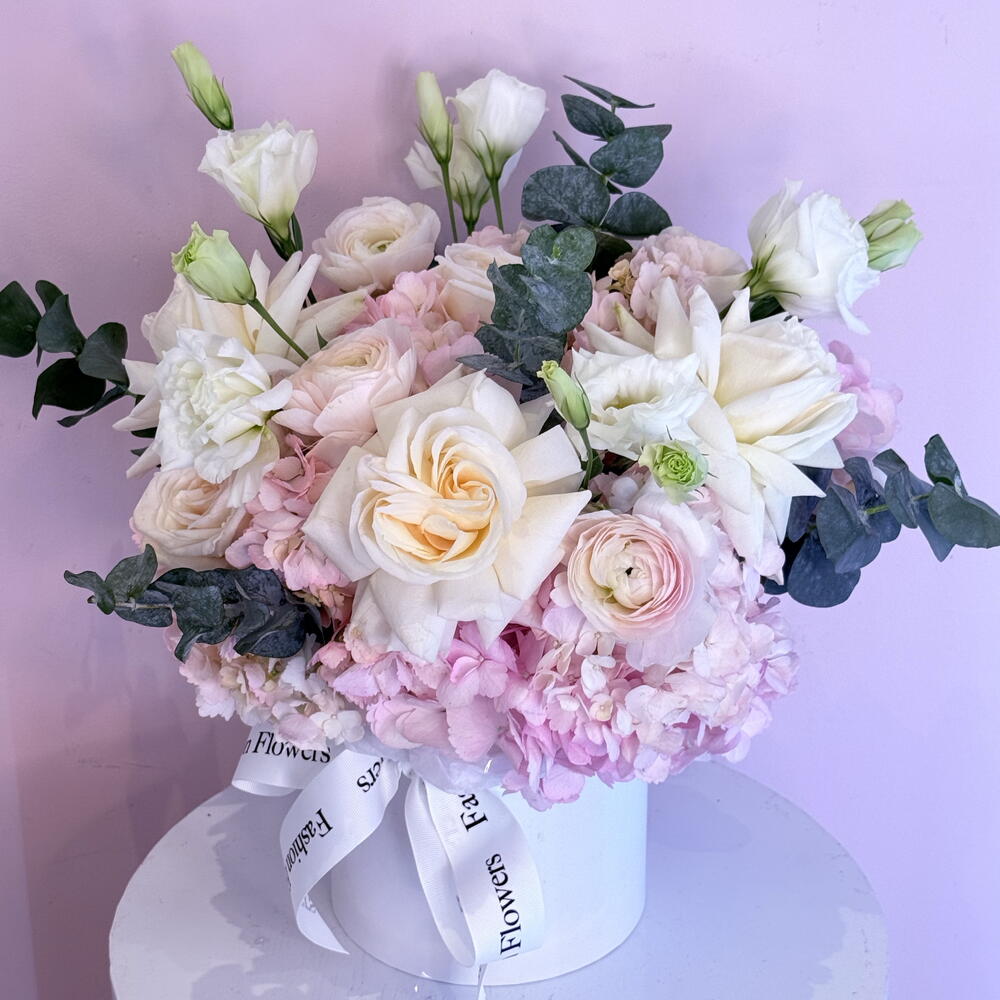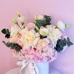 eukaliptusz - 5 db. Lisianthus - 3 db. hortenziák - 5 db. rózsák - 5 db.