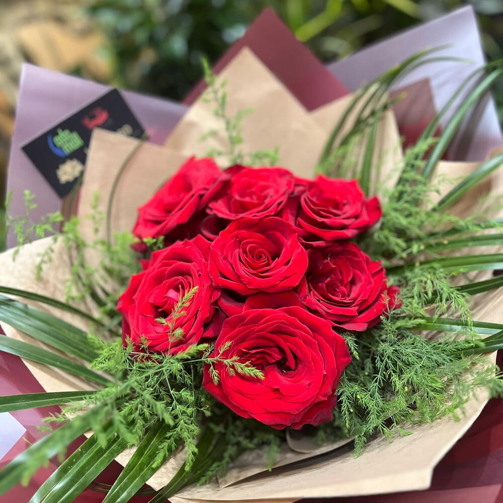 Lovely bouquet with 7 red roses. Note: The design of the bouquet can be changed to a similar one if the required material is not available