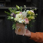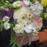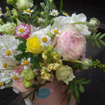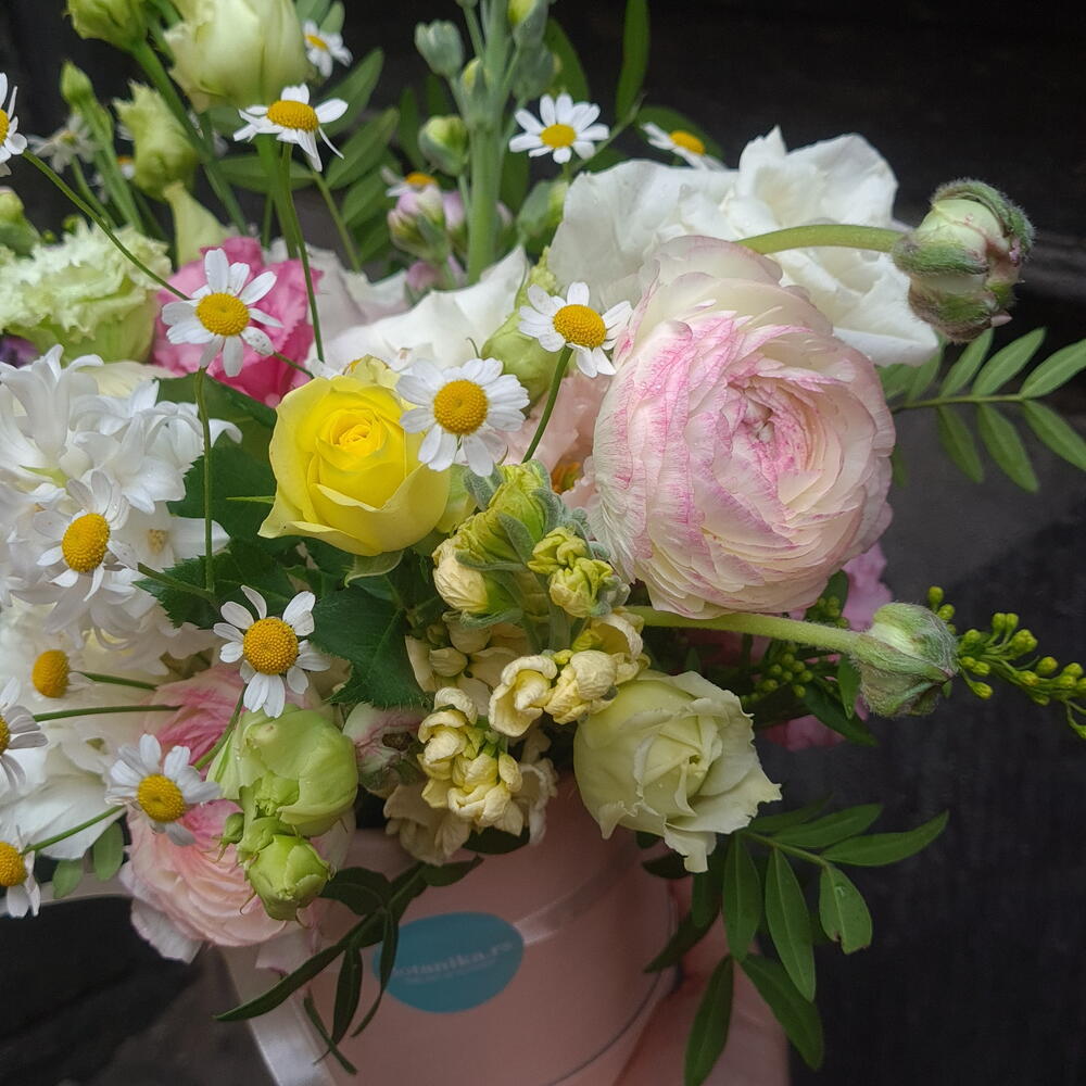 Doboz - 1 db. Dekoráció - 1 db. Jácint - 1 db. Oázis - 1 db. kamilla - 1 db. szegfű - 1 db. ranunkulusz - 3 db. matthiola - 3 db. zöld keverék - 1 db. mini roses - 1 db.