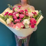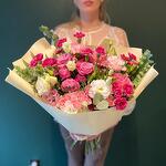 Eustoma - 2 db. Pistácia - 4 db. szegfű csokor - 4 db. rózsa - 3 db. eukaliptusz - 2 db. spray rózsa - 2 db. dekoratív papír - 4 db. levél - 2 db. szegfű gólązkowy - 4 db.