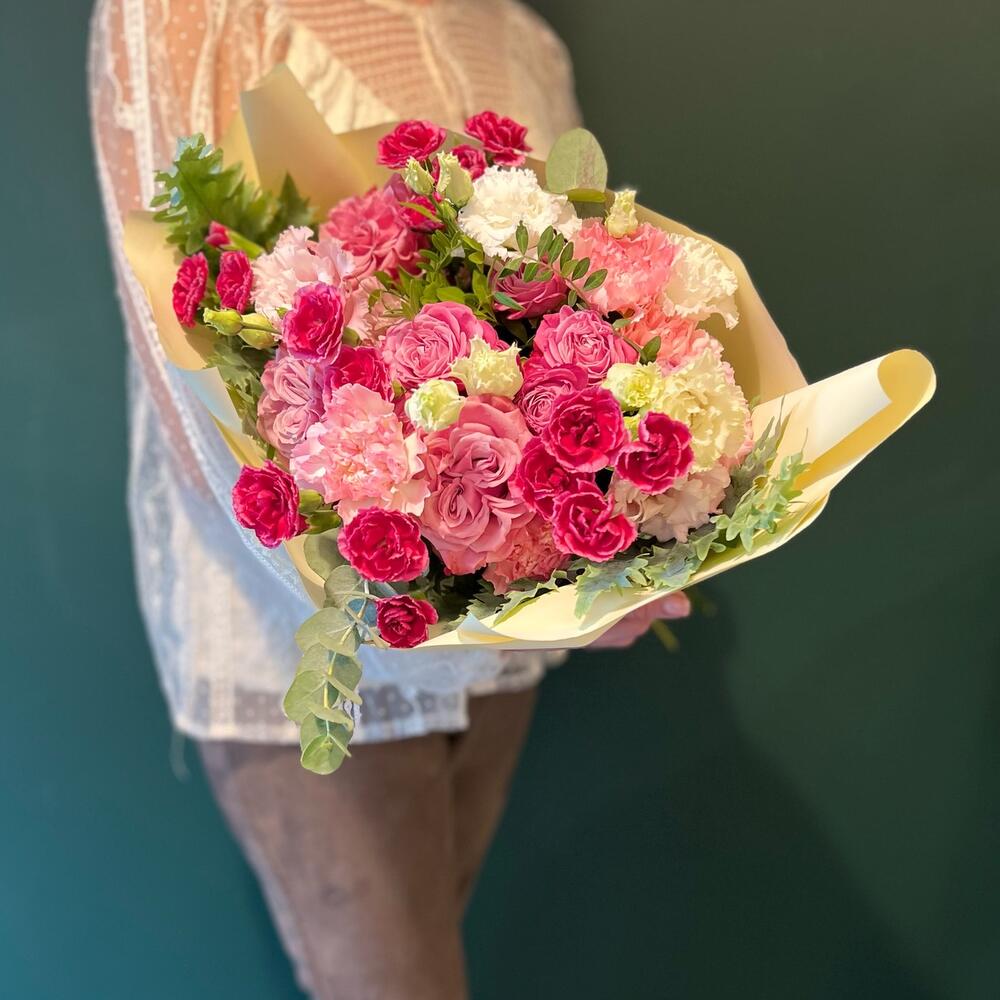 Eustoma - 2 db. Pistácia - 4 db. szegfű csokor - 4 db. rózsa - 3 db. eukaliptusz - 2 db. spray rózsa - 2 db. dekoratív papír - 4 db. levél - 2 db. szegfű gólązkowy - 4 db.