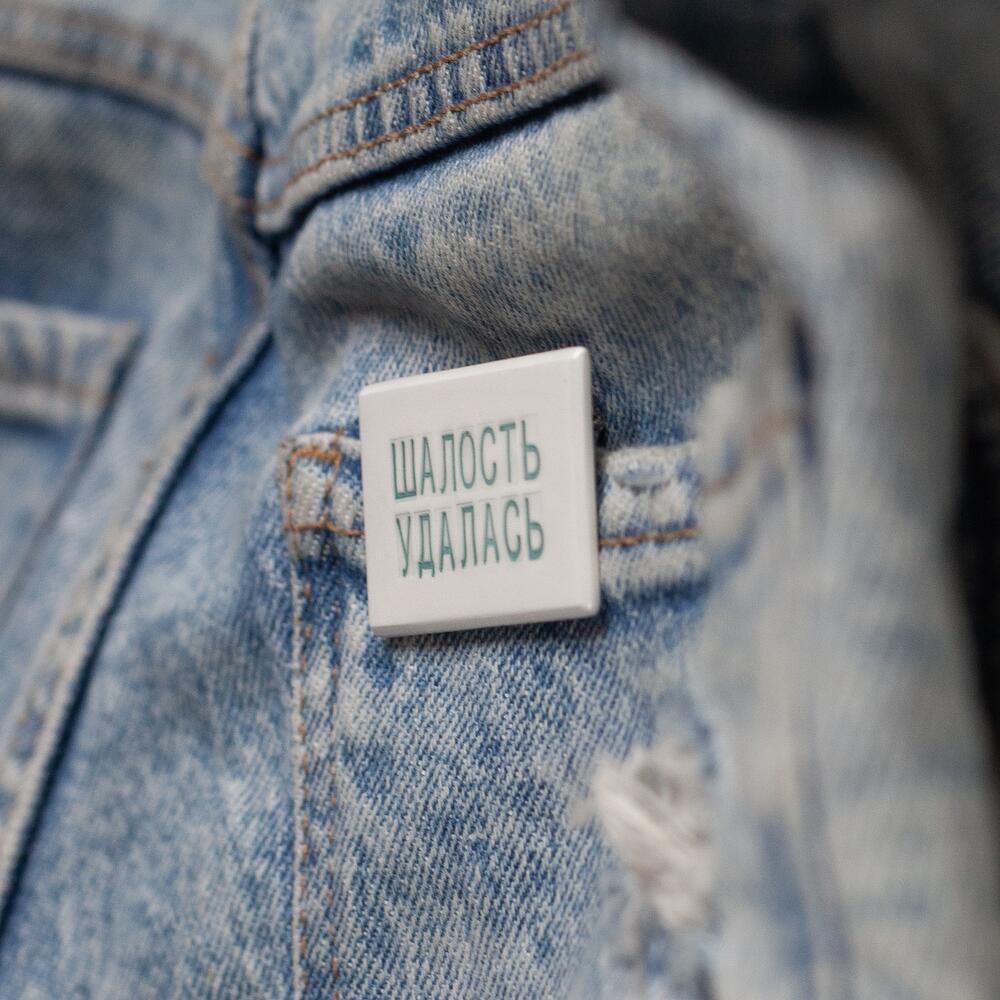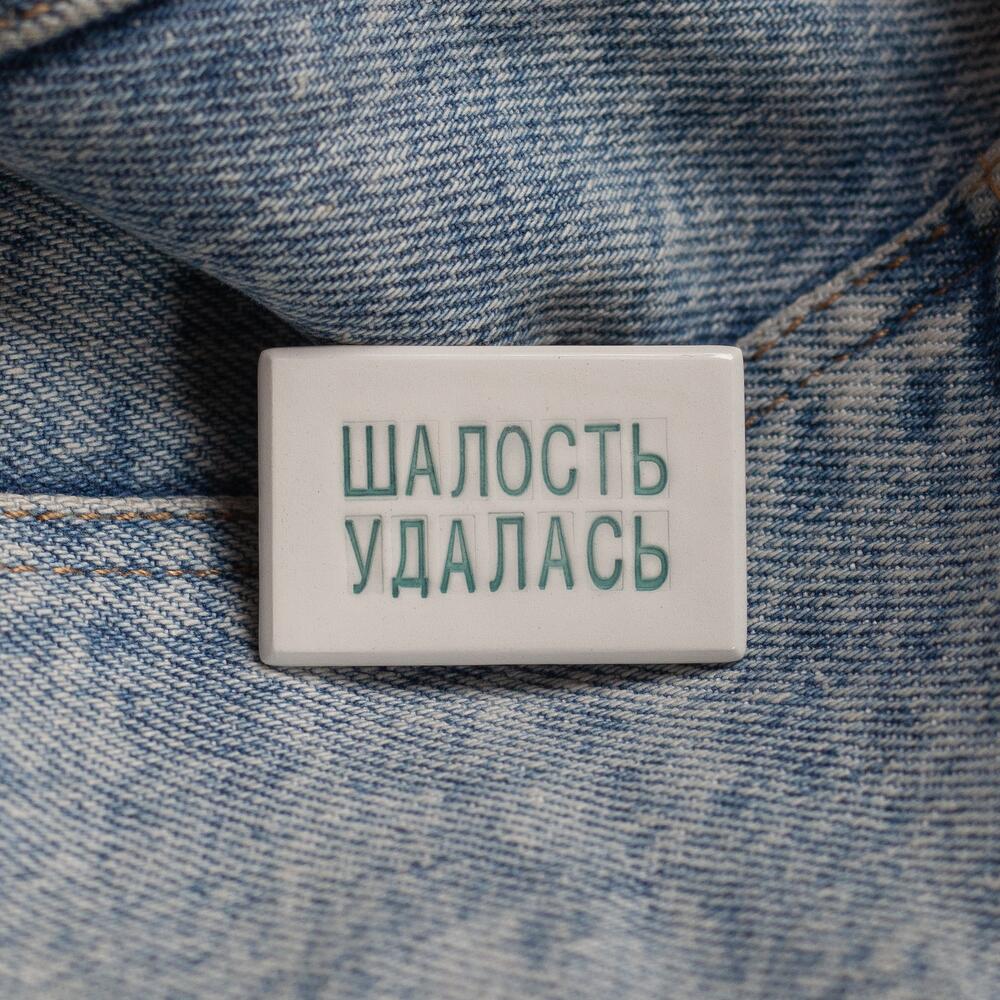 Handmade ceramic badge with Russian phrase Шалость удалась (mischief managed)