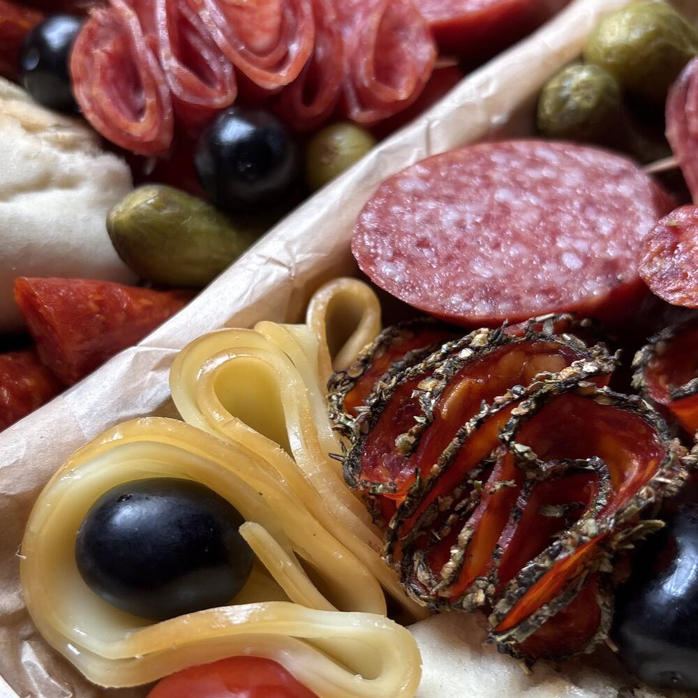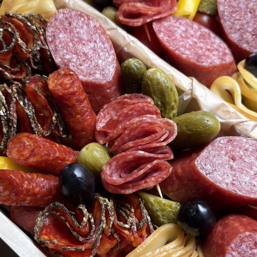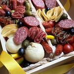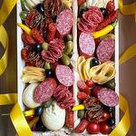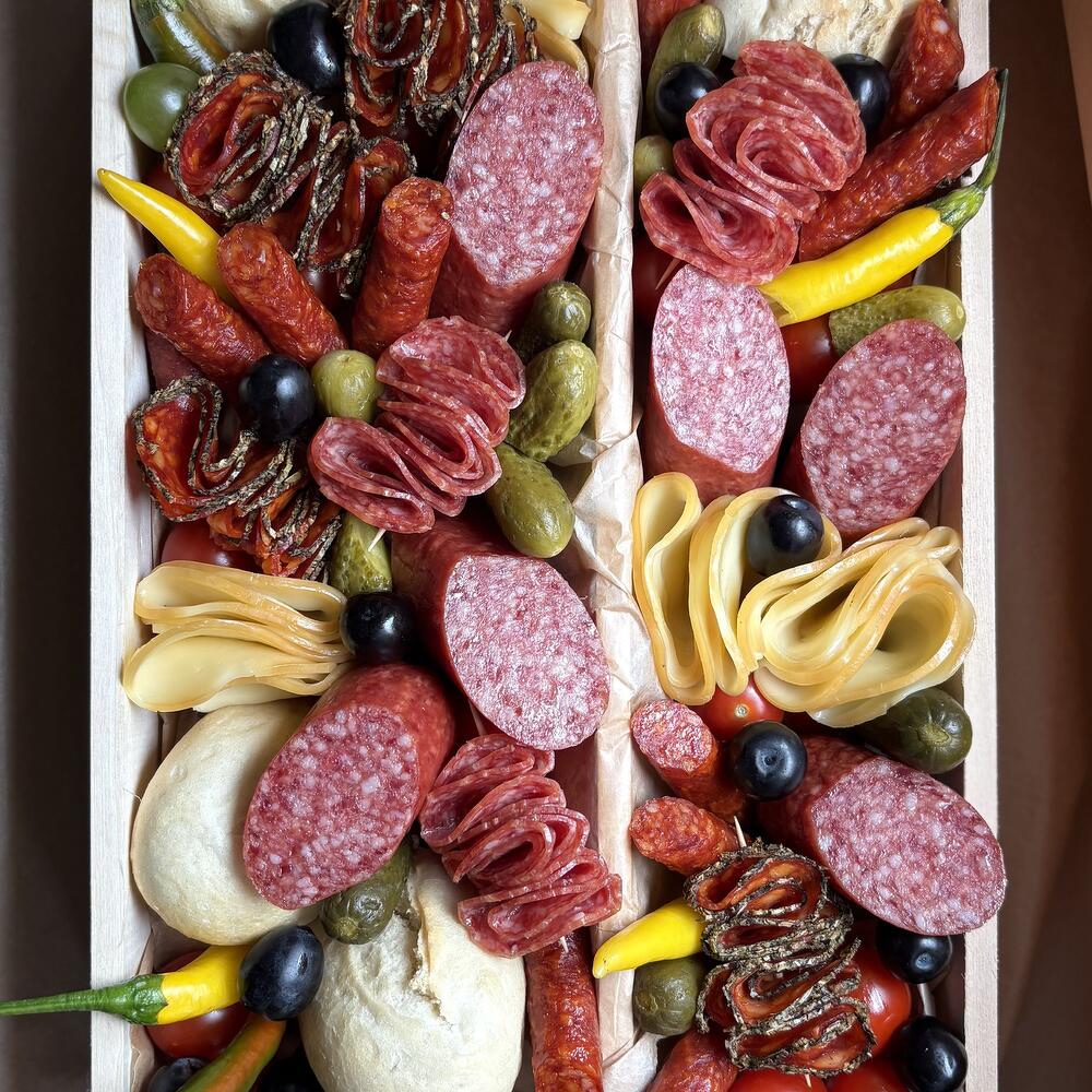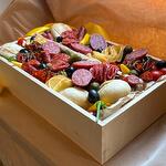 grapes - 100 g celofan - 1 db. kulen - 100 g cajna kobasica - 300 g traka - 1 db. chili paprika - 2 db. kobasica budimska - 100 g seri - 200 g kifle - 2 db. drvena gajba - 1 db. sir - 100 g kobacice - 100 g