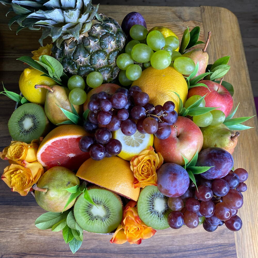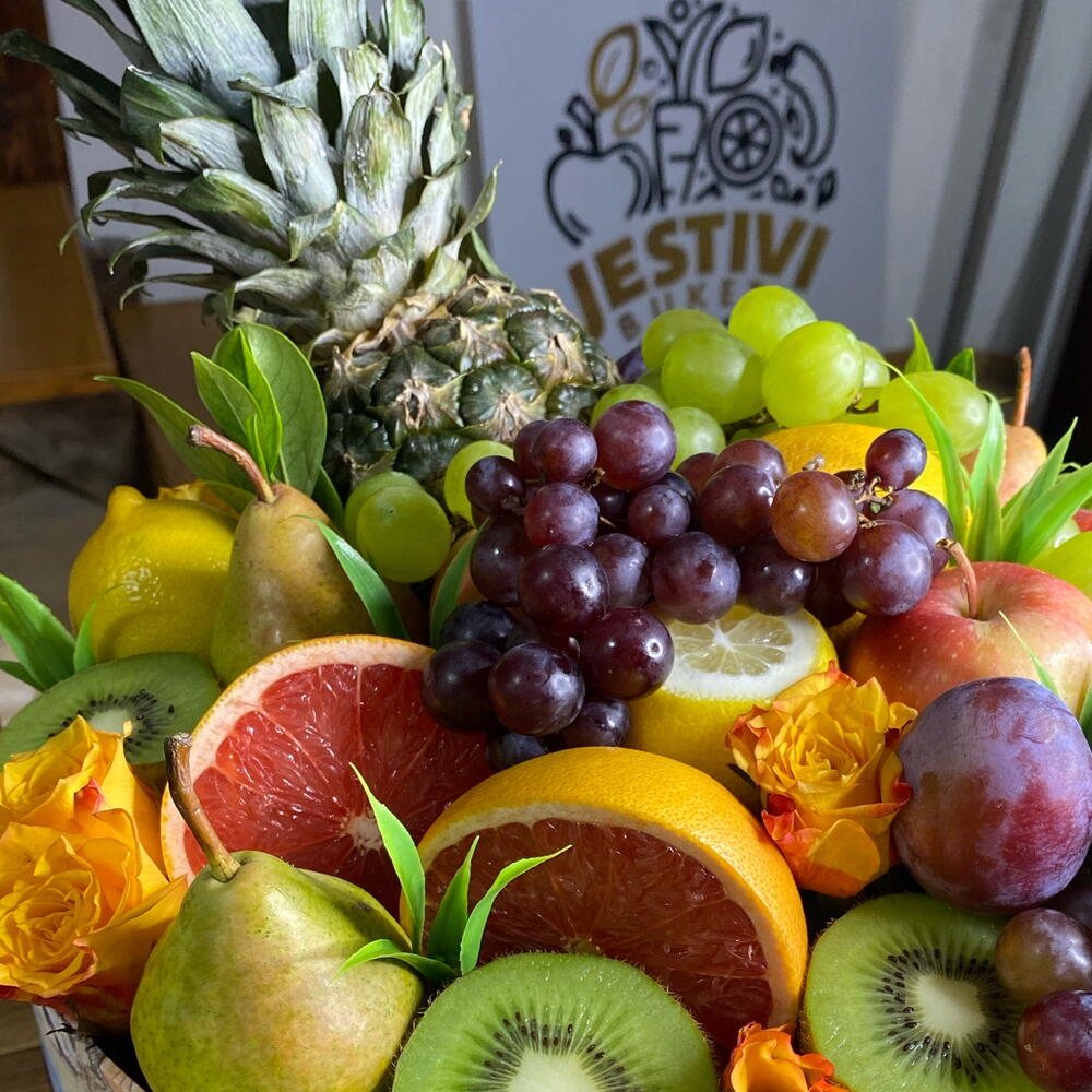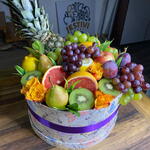 Zöld levelek - 9 db. grape - 500 g pears - 5 db. apples - 4 db. pineapple - 1 db. kiwi - 1 db. lemon - 3 db. eper - 5 db. kerek doboz - 1 db. mini roses - 5 db. greifrut - 2 db.